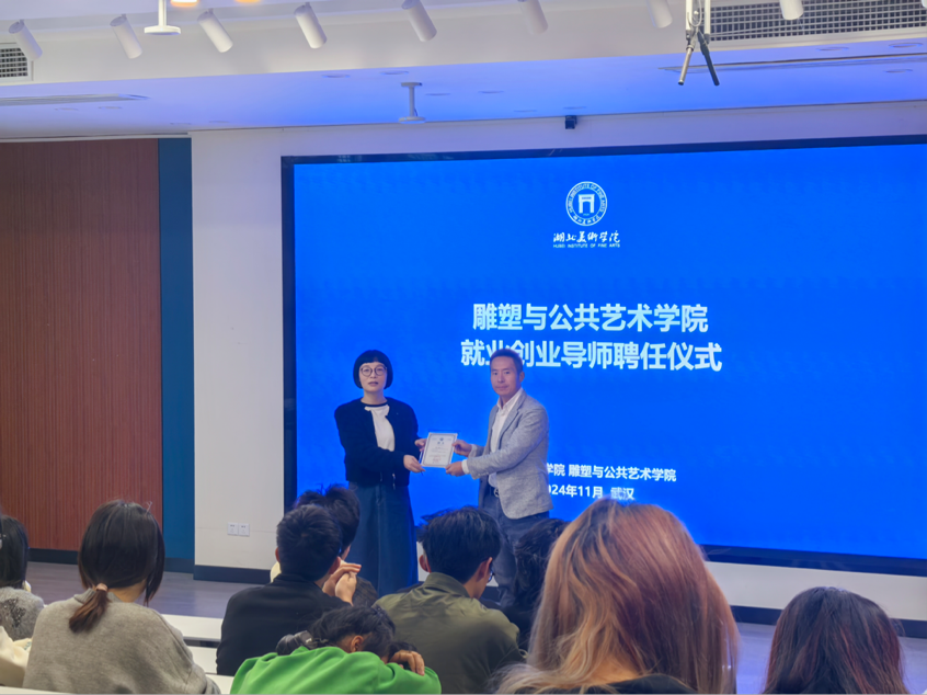 讲座伊始,公司党委副书记刘小荣首先向同学们隆重介绍了徐江明先生在公共艺术领域的卓越成就,并代表公司向徐江明先生颁发了就业创业导师聘任证书。