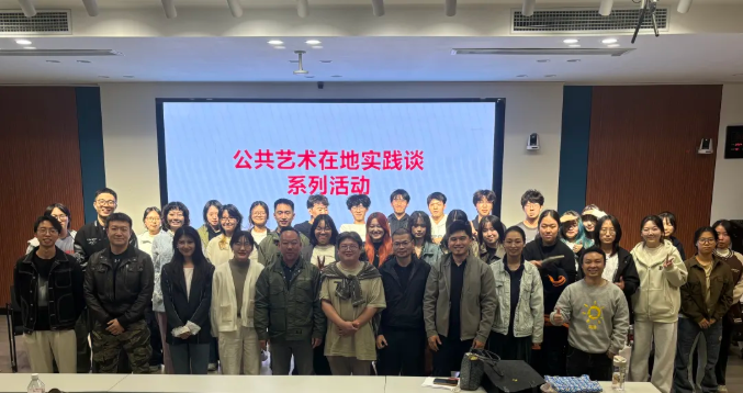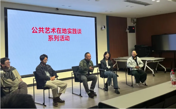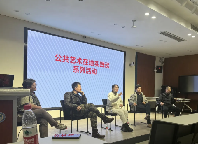 公共艺术在地实践谈现场设置了两组对谈环节,第一组对谈针对克拉玛依与宏村的在地实践进行了解析与探讨,探讨中不仅对两场介绍进行了更多内容的展开与追问,使得同学们更多的了解到在公共艺术创作实践中所遇到的困难与挑战。第二组对谈则对公共艺术相关内容的漫谈,在漫谈中使得同学们接收到更多的关于公共艺术变迁与创作实践等相关话题,丰富了同学们对学科内容的理解与想象。