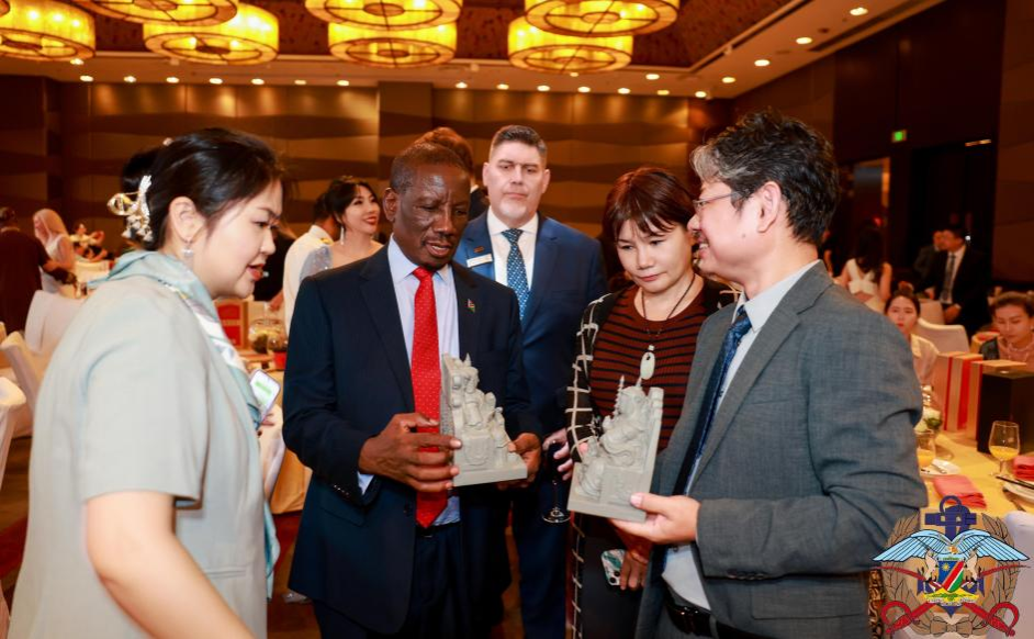 图2纳米比亚驻华大使凯亚莫Kaiya Mo与武官汤扎亚Tjandja与嘉宾合影