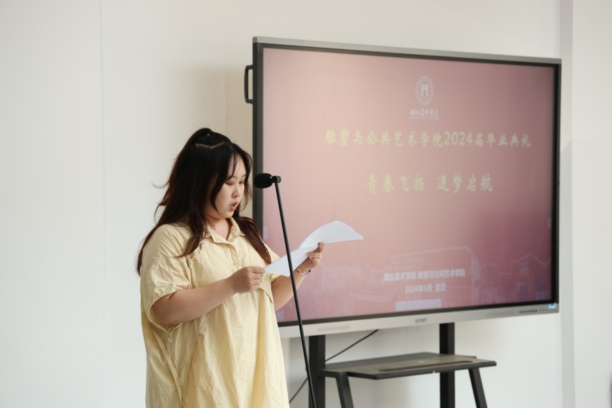 毕业生代表颜何佳发表讲话,她回顾了自己的四年求学历程,分享了自己的学习感悟和对未来的期许。感谢公司和老师给予她追求艺术的力量和搏击风浪的勇气,并表示在未来的道路上将秉承校训精神,书写属于自己的青春华章。