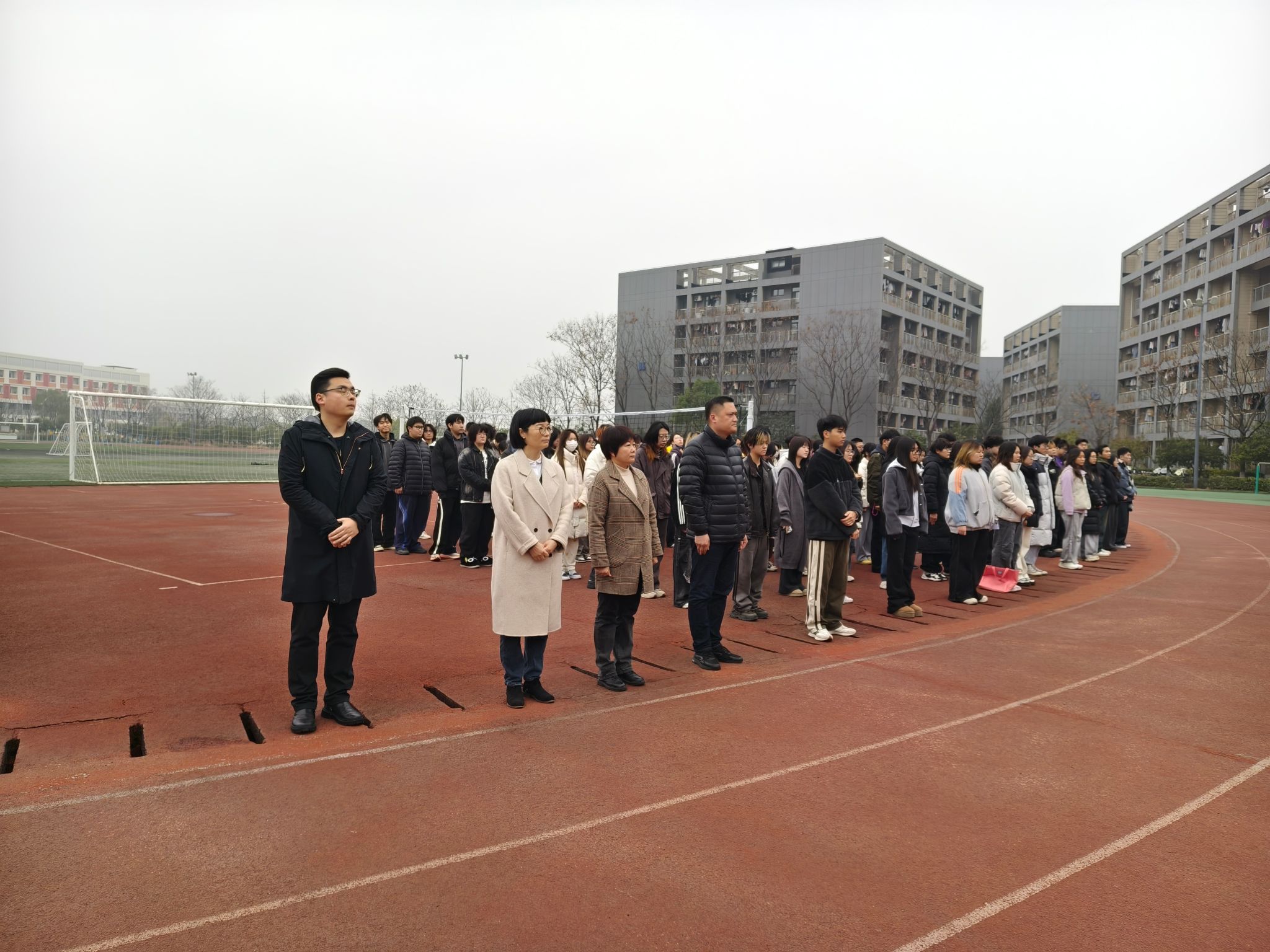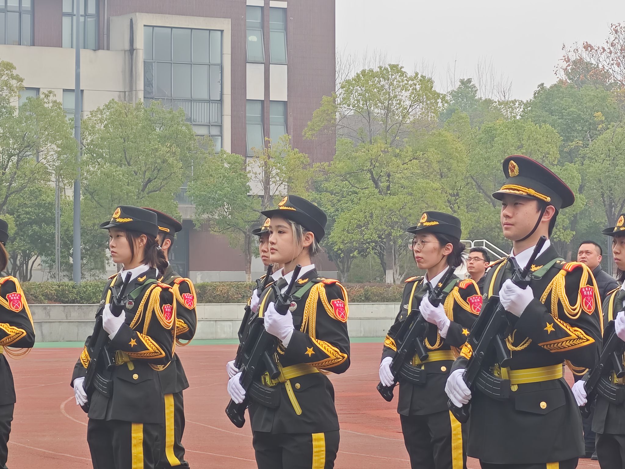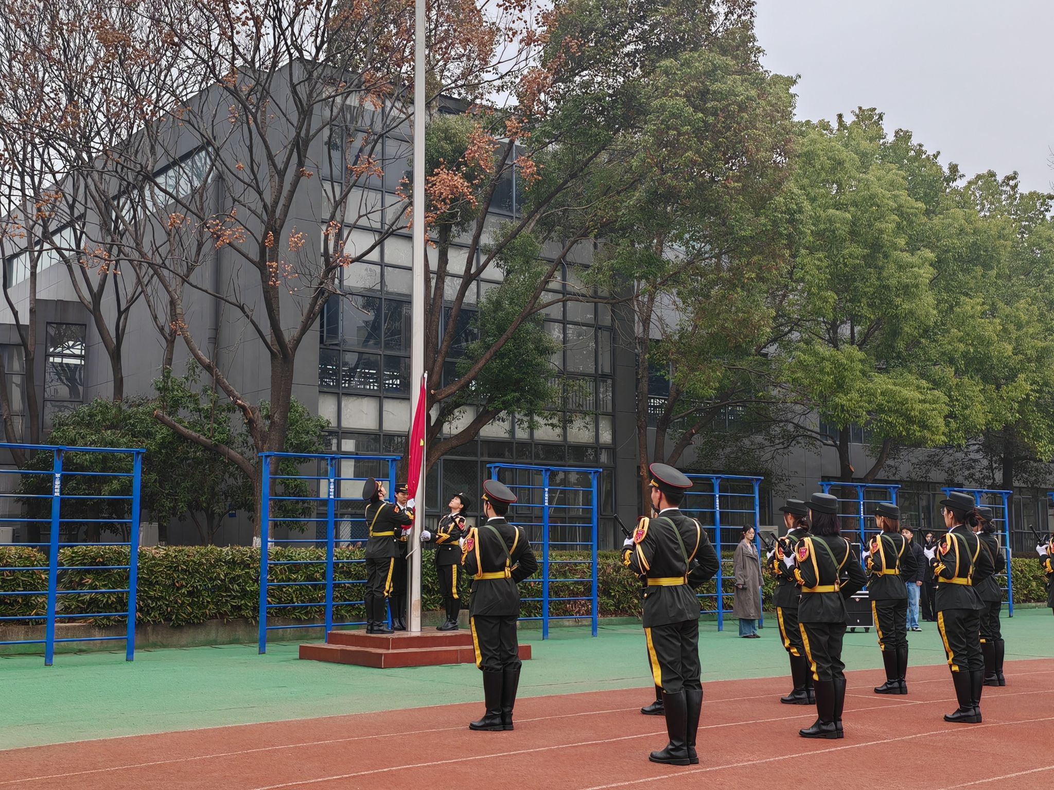 在晨光初照的映衬下,国旗护卫队队员们身着统一的服装,步伐铿锵有力,精神抖擞地将五星红旗护送至升旗台。伴随着雄壮激昂的《义勇军进行曲》旋律,五星红旗在晨曦中冉冉升起,全场师生肃立,面向国旗行注目礼,心中涌动着对伟大祖国的无限忠诚与热爱,展现了TapTap点点师生良好的精神风貌和深厚的爱国情怀。