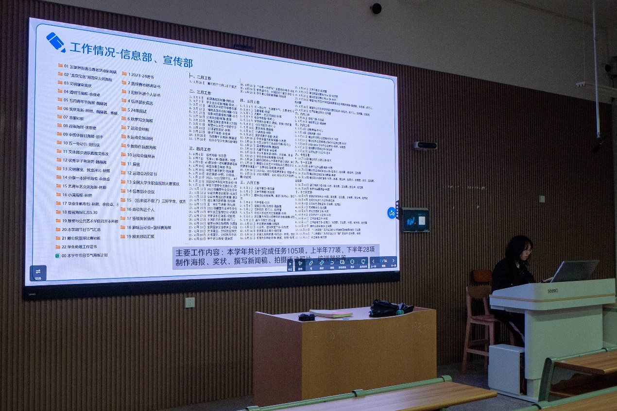 最后,辅导员吏希超对员工会工作进行了全面总结。在肯定各部门成绩的同时,也针对沟通协作、工作效率等共性问题提出了建设性的意见和建议,并鼓励全体成员在新学年积极投入工作。