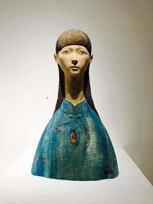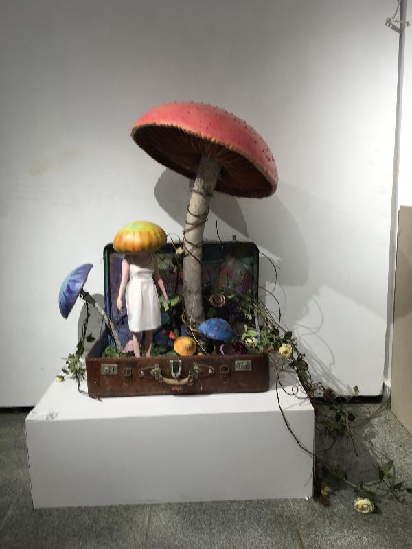此次展出的作品形式多样、风格迥异,其中既有体现传统雕塑艺术基本功的写实作品,也有表达年轻艺术家们运用创新思维、创新技法所创造的现代抽象雕塑作品。展厅里面的作品琳琅满目,让人简直都看不过来。展厅一角一个旧箱子,里面几个大大小小的蘑菇,各种植物,一个头顶蘑菇的小姑娘等,营造出一种童年的感觉。