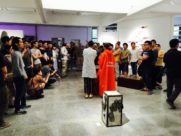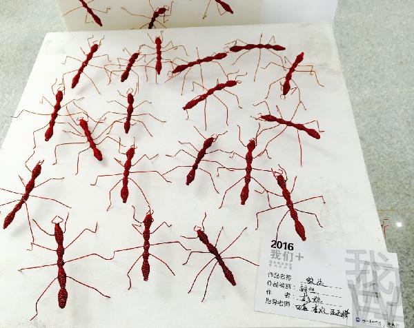 彭炜的创作作品《蚁生》,让人感觉汗毛竖起。在展台上作者用铜丝做出了许多蚂蚁,分散在展台上密密麻麻。在让人毛骨悚然的同时,也感受到了作者对自由、生命的思考,同时也给观众以思考。