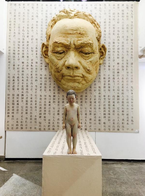 另外陈营的新具象作品《禁忌》占据了展厅大幅的位置,墙上一个巨幅的人像,前面站着一个小孩像是在低头沉思。在巨幅人像的后面是一段段引人深思的话:事常与人违。事总在认为。骏马是跑出来的,强兵是练出来的……。