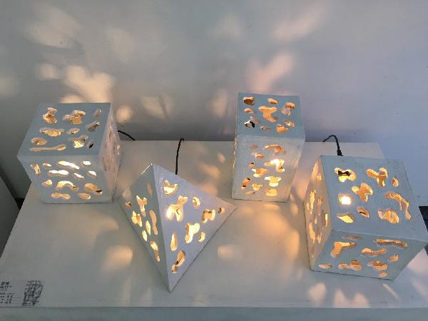 另一件作品刘玲同学的《斑》。四个形状不同的箱子,借助箱子里的灯光在外面投下了点点斑驳。同学们用他们四年学习到的知识完成了完美的毕业作品。
