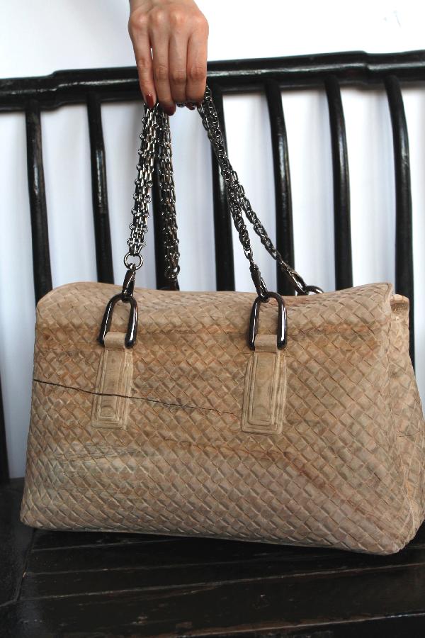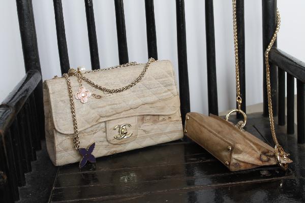 魏冉的木雕作品《包》。三个包的形态各异,其精致程度让人惊叹不已