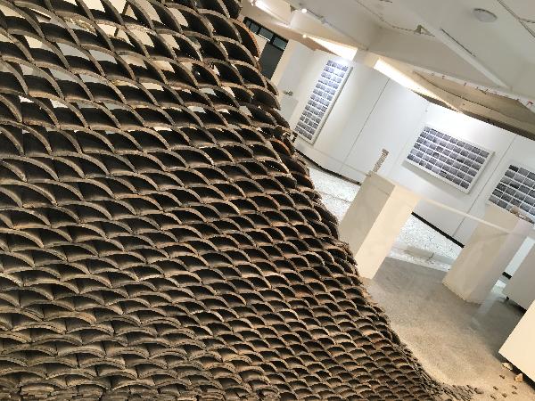 周艳阳的作品《瓦当》的效果十分震撼,作品尺寸高5米,长,宽各四米。作者用无数片的瓦当或完整或破碎组成作品。