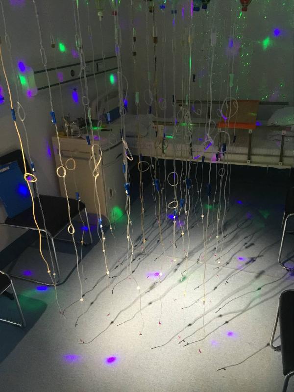此次研究生毕业展的作品一共有5件。有用综合材料创作的,也有用木雕的方式呈现的,或用影像装置来表现创作,形式多样。其中,张必阳的创作作品《特快专递》特别引人注目。作品尺寸4mX2.3mX2.35m,材质是木材,铁,纸板,塑料,塑胶,不锈钢,多媒体影像。作品以当下流行的互联网快递作为载体,运用意识流的手法将病房打造为运输物品,巧妙的将快递与病房有机结合起来,该病房不同于普通病房,其吊瓶是由各种不同颜色的饮料瓶制作而成,室内灯光由激光,霓虹灯组合而成,药品由形态各异的糖果制作而成……荒诞的同时引发了对人们生存环境的思考。