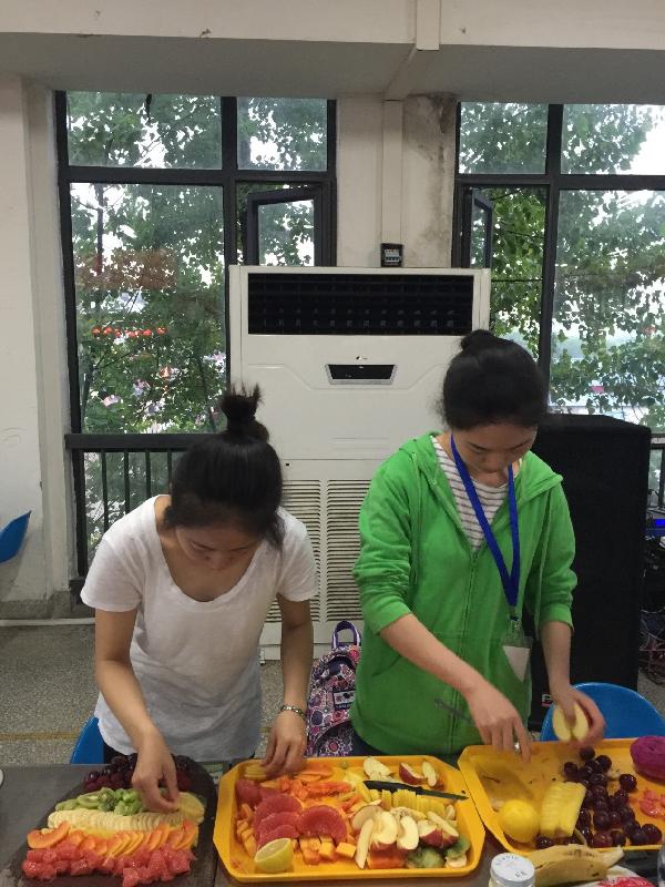 雕塑系参赛队员准备以“鲨鱼”和“彩虹”为主题的水果拼盘