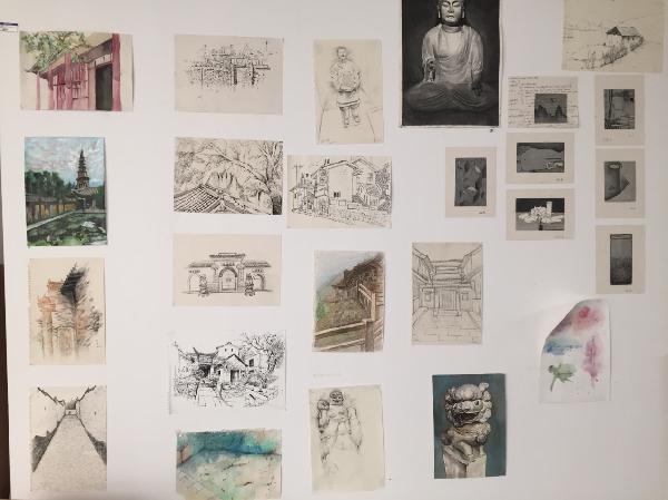 同学们在老师的带领下游历了当地的自然风貌,感受了不同的人文风情。正因为如此,当我们观赏这些写生作品时,能在获得视觉冲击的同时感受到作品本身的魅力,和大家在写生创作过程中的饱满热情。画中的每一个细节都来自于真实的细节却又极具创意,不拘泥于形式。材料运用大胆,表达十分练达,例如,用泼墨表现佛像的形象,用淡彩表现古代玉器质朴纯粹。由于此次展出优秀作品较多,作品种类多样,观展热度也在持续加温。