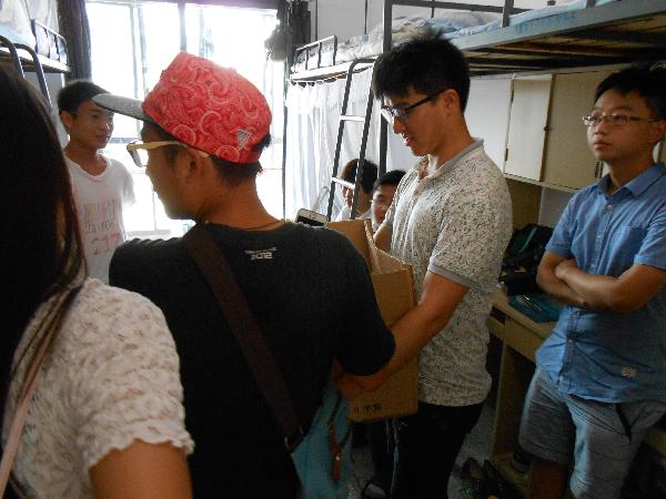 2014年9月5日下午4时许,此刻距离新生报到工作结束还不到半个小时,在大一新生已经充分感受学长学姐们热情周到的服务后,为了让他们进一步体会到大公司园的温暖,我系组织了传温情“送月饼”活动。辅导员贺芳和部分员工会干部来到14级新生宿舍看望新生,给予了他们亲切的关怀和慰问,并为新生们送上中秋月饼和节日的祝福,每个人脸上都带着轻松愉快的笑容,彼此间仿佛多年不见的好友,此刻一聚,未见一丝生疏感,同学们拿着月饼,笑在嘴边,甜在心中。