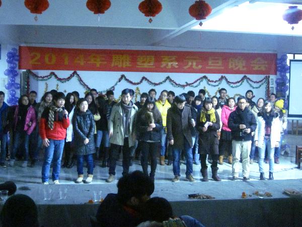 新闻网讯(通讯员:卢倩 摄影:李振)2013年12月26日晚7时,雕塑系在A5教学楼举办元旦晚会。晚会由刘睿韬、喻婕、山育崇、颜诗瑶主持,系党书记、系主任、副主任及系专业老师出席晚会。
