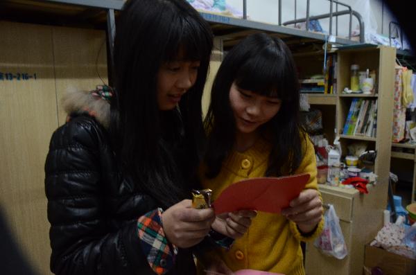 图二:女生们正在读者一份份温馨的祝福语