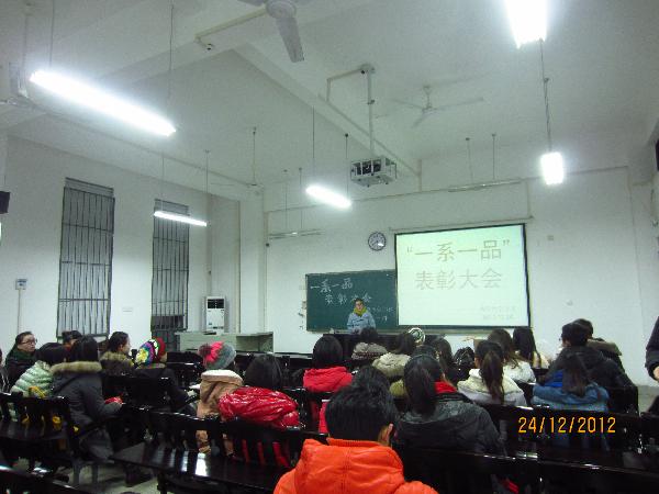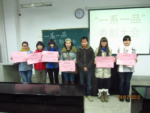 新闻网讯(通讯员 陈诗哲)为了激发同学们的学习热情,增进高低年级员工的交流,于2012年12月24日17:30,我系在A12教学楼110教室隆重举行了第二届雕塑系“一系一品”表彰大会。雕塑系辅导员陈丹参加了表彰大会,会议由“一系一品”负责人袁源主持。