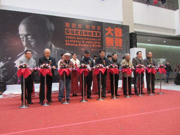 图一:嘉宾为“大器无声——雕塑家、教育家张祖武百年纪念展”剪彩