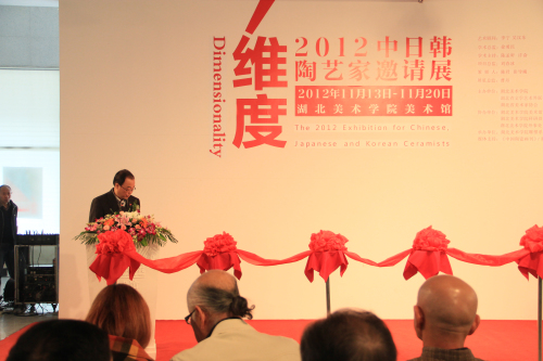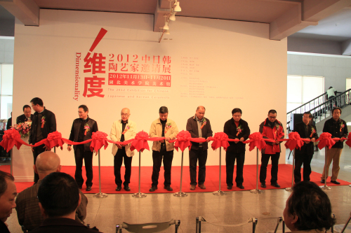 随后,省文化艺术联合会副主席李宁,湖北省美术家协会秘书长刘春冰,中国工艺美术学会陶瓷专业委员会秘书长毛曾印,日本陶艺家代表池端宽,韩国陶艺家代表李宪国,江汉大学现代艺术公司经理王心耀,景德镇陶瓷公司陶瓷艺术公司陶艺系主任金文伟与校校领导,经理徐勇民一同为本届邀请展开幕剪彩。