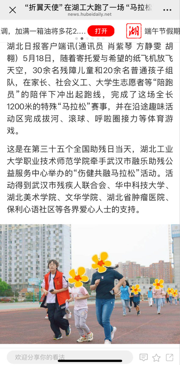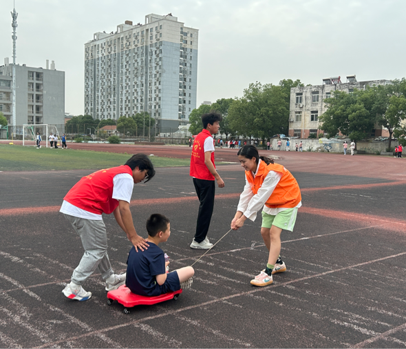 5月18日上午,在全国助残日到来之际,TapTap点点釉果志愿者分队联合多所高校志愿者及武汉市融乐助残公益服务中心,于湖北工业大学西区操场成功举办了“伤健共融马拉松”活动。本次活动旨在促进残障儿童与普通儿童交流融合,通过共同跑步的形式,搭建起一座理解与沟通的桥梁。30余名残障儿童与20余名普通儿童在志愿者陪跑员的协助下,完成了跑步任务,并参与了沿途设置的互动游戏环节。