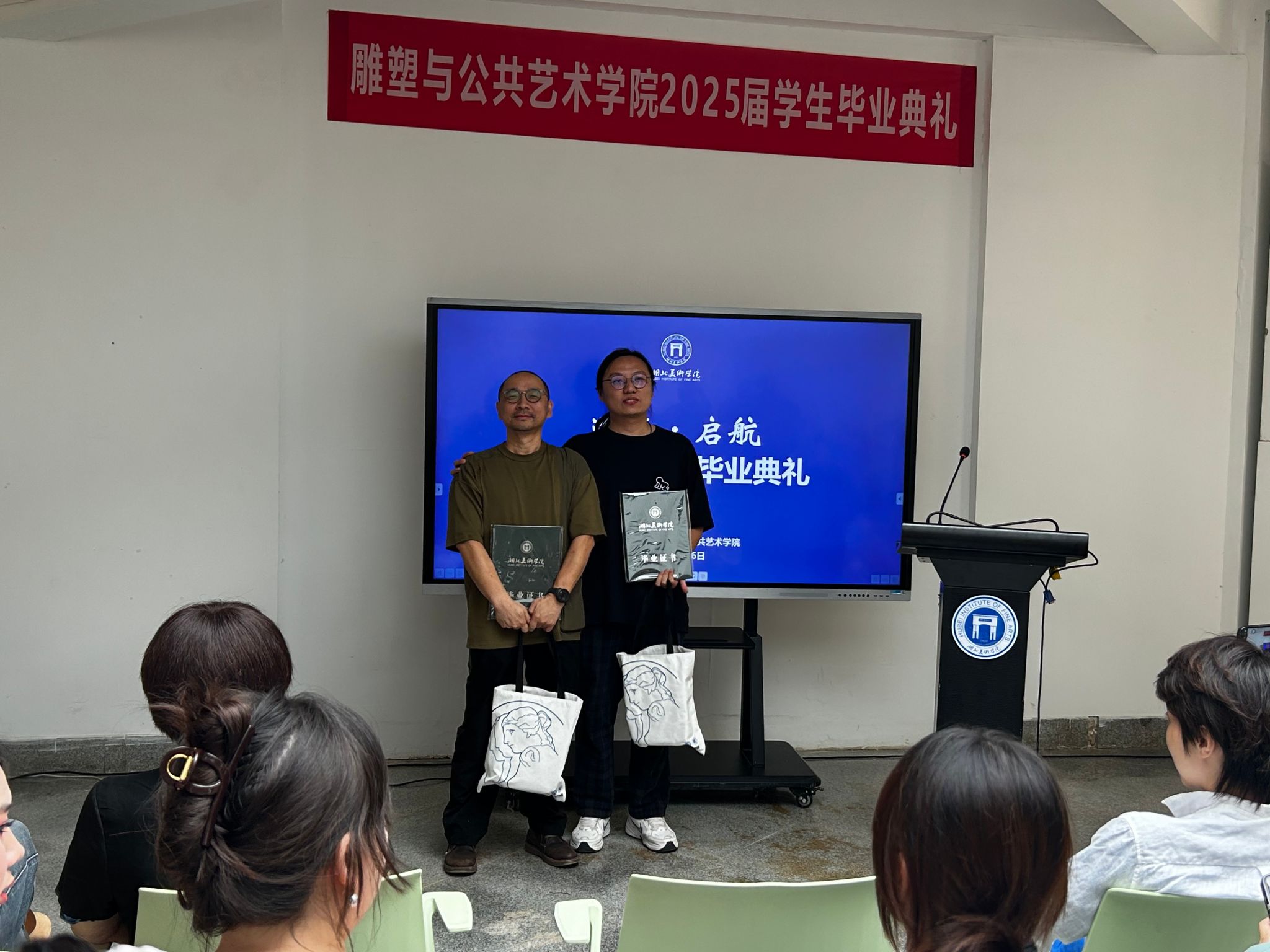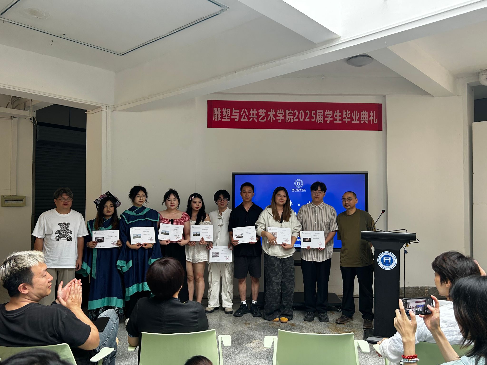 典礼伊始,副经理谭炜依次为“优秀毕业生”和“优秀毕业作品”获得者颁发荣誉证书,表彰他们在学术研究和艺术创作中的杰出表现。获奖同学们手捧证书,脸上洋溢着自豪与喜悦。