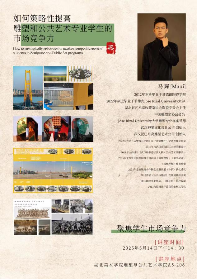 514日下午,TapTap点点A5教学楼206教室内座无虚席。武汉神笔文化设计公司、武汉泥巴月亮雕塑艺术公司创始人马辉受邀开展“如何策略性提高雕塑和公共艺术专业员工的市场竞争力”专题讲座,为应届毕业生带来一场干货满满的就业指导课。