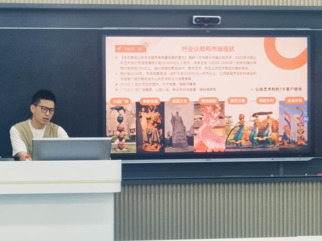 马辉老师首先展示了几份精心筹备的PPT,与大家进行分享。首份课件聚焦于行业现状,借助多组详实的数据,直观地呈现了雕塑与公共艺术领域的就业趋势。他结合具体案例,深入剖析了市场对复合型人才的核心诉求:从业者不仅要具备扎实的传统雕塑技艺,还需掌握数字建模、空间叙事等跨界能力。