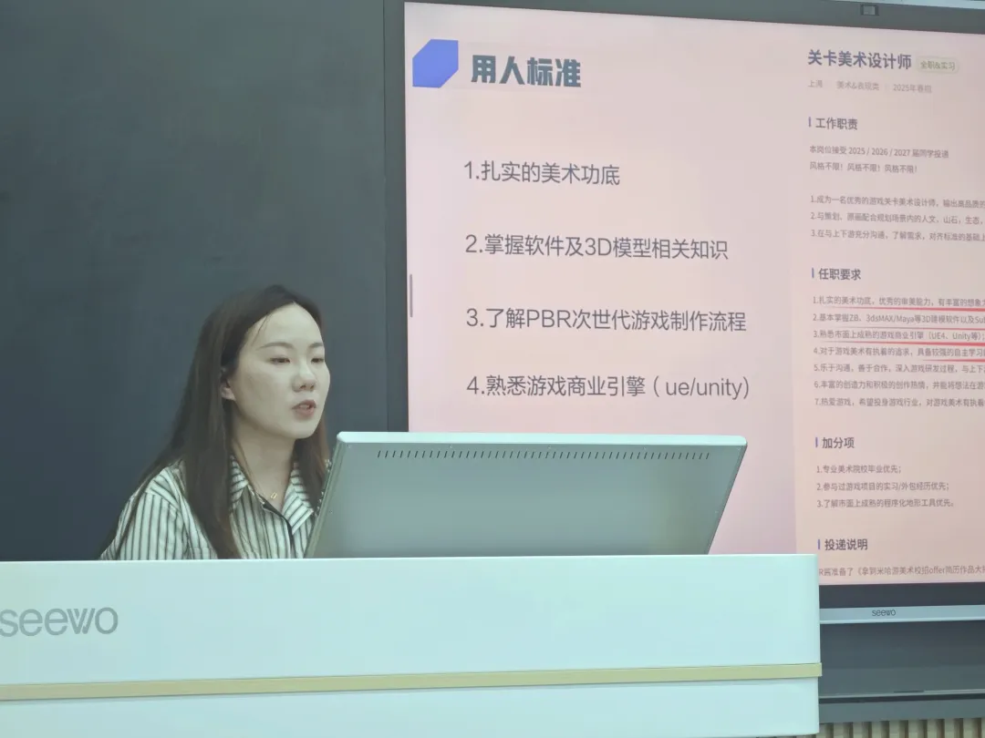 讲座中,童梦琪老师围绕“三维美术技术革命行业洞察”“三维领域赛道与就业机会”“企业人才选拔标准”以及“创宇游戏招聘宣讲”四个方面进行了深入讲解。她详细介绍了三维美术在当前产业中的重要性和应用前景,分析了行业发展趋势和就业机会,并分享了企业在选拔人才时的标准和要求。