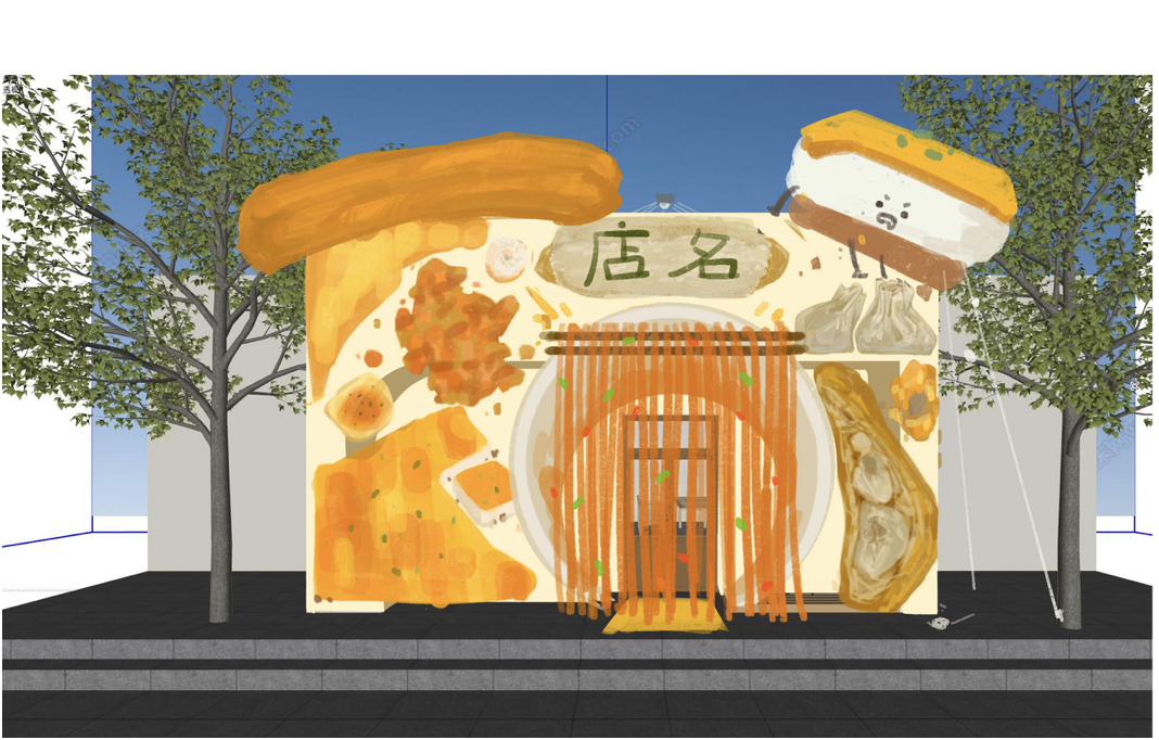武汉,这座充满烟火气的城市,过早是其独特的文化符号,而黄鹤楼街道与西厂口地区则是展现这一文化的绝佳舞台。过早于武汉人而言,是每日清晨的仪式,是生活热情的迸发。食物,也是最直接最简单的能获取幸福感的方式。在这一地区创作以武汉的过早为主题的作品,能生动展现城市的灵魂。热干面、豆皮、面窝等特色早点琳琅满目,它们不仅仅是食物,更承载着武汉的历史、民俗与人文情感。选择此地,是因为周边熙熙攘攘的街道、往来的居民与游客,构成了过早文化天然的展示空间。在实地考察和与老师沟通后,发现关于以过早为元素的文创产品已经推出,并打算在西厂口社区和黄鹤楼街道进行售卖,于是想与之前设计的同样与武汉过早元素创作的小插图结合,同时对文创内容进行了参考,做一个宣传和广告为目的的店面设计。由于先贤伴山老街与火巷里预备重新规划和设计,没有明确点位,所以设计店面方向为早餐店、咖啡/简餐店、文创店、暖心驿站或社区街道便利店等,可根据需求变化。