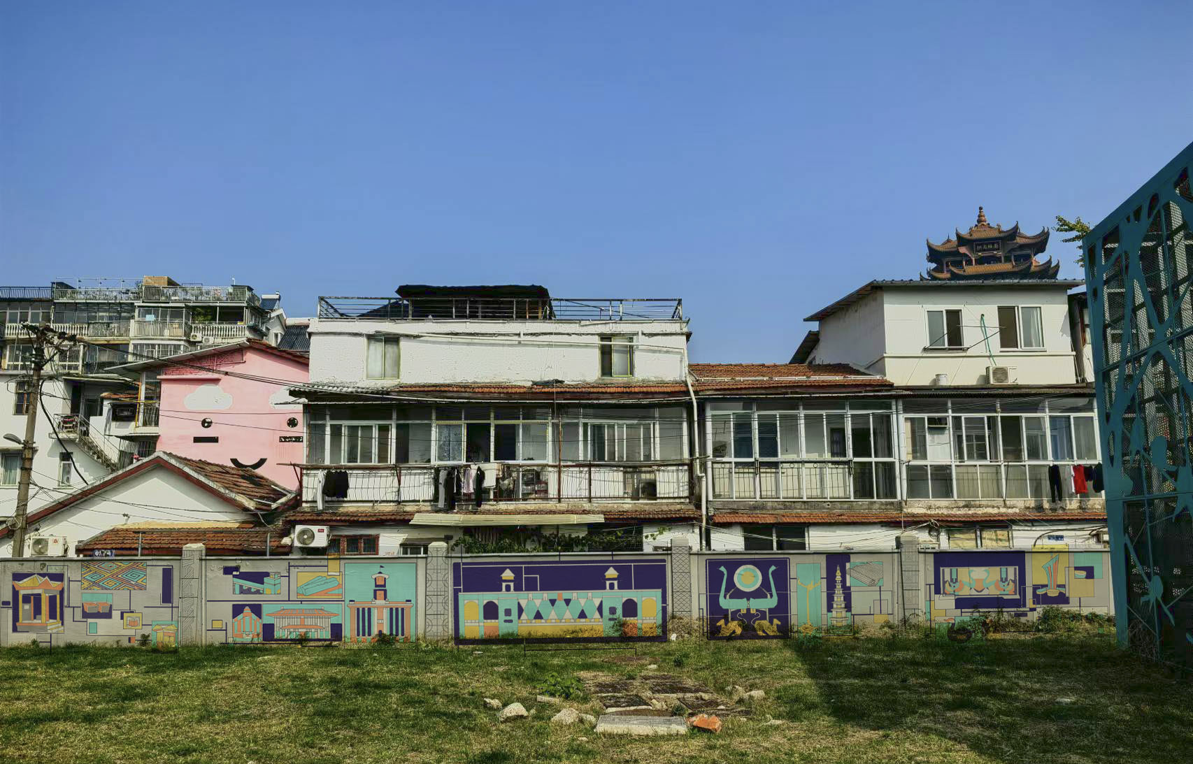 使用墙绘的形式, 以多边形色块的方式,构建出黄鹤楼和附近建筑的外形,搭配曲线来勾勒天空中的云,并通过曲线的走向表现出云和风的流动。选用黄鹤楼的元素符合当地的生活环境,而且背景的现代式建筑也与古建筑的风格形成对比但又不会太脱离实际生活环境。
