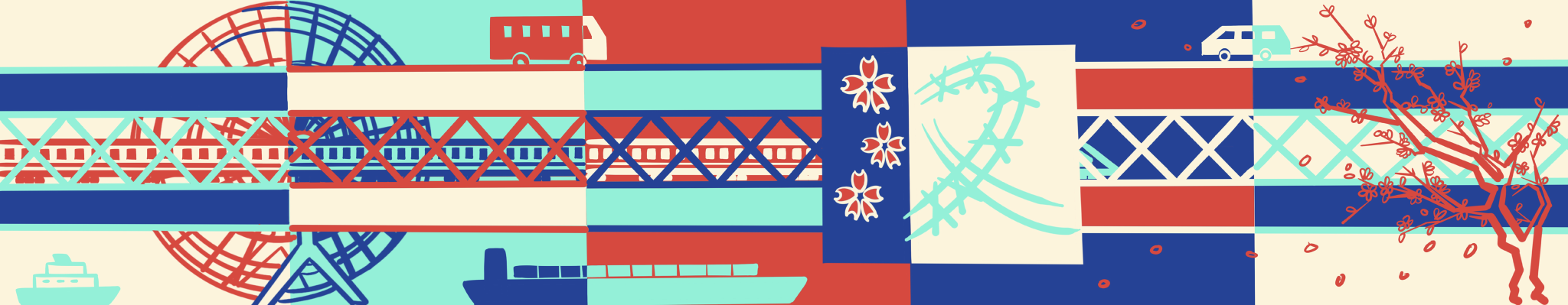 以武汉的著名地标长江大桥为主体物,贯穿整幅作品,三条道路都有各式各样的交通工具,武汉长江大桥不仅贯穿的是城市与城市,更是时代跨越的标志,在长江大桥的周围增添一些武汉的特色(有火车站,黄鹤楼,热干面,梅花之类)。颜色主要以四个颜色为主,颜色重复但内容不一样,使得墙面为一个整体。有利于宣传武汉的文化,起码让长江大桥三路合一的印象深入人心,由于颜色简单有特点可以做相同色调的海报,有通知通告之类的,粘贴在社区不同的小角落来宣传和告知也别有一番趣味。