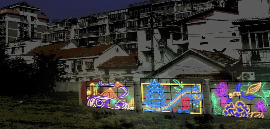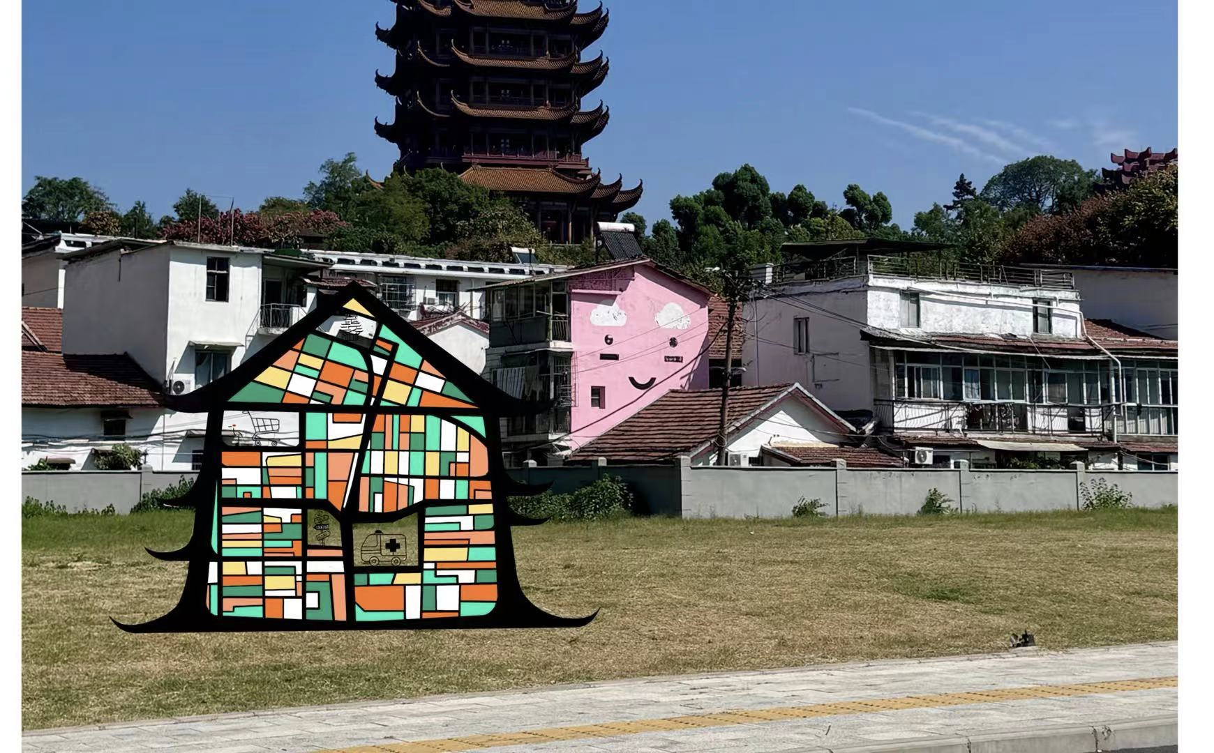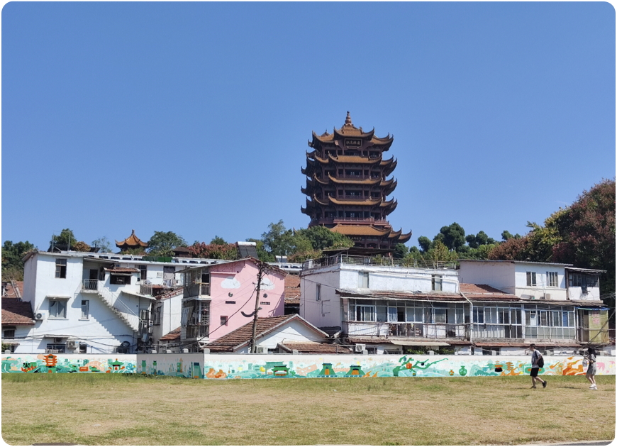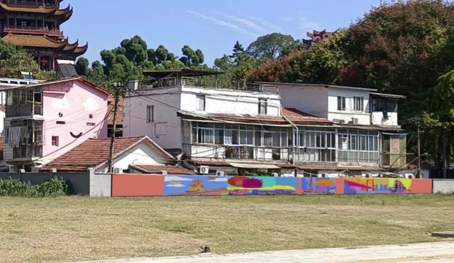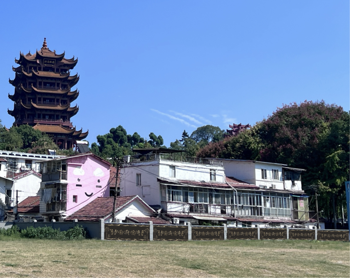 开阔的街路让所有人眼前一亮,颜色靓丽的黄鹤楼被喷绘在道路两侧的白墙上,群山蜿蜒的绘画延伸了这条路的尽头。 “把历史画在墙上,让经过的人都能看到,不仅装点了社区环境,还对文化本身有别样的意义。〞但在最后我们来到正对向黄鹤楼的空地上,发现这一片区的墙壁是空白的,作为一个适宜的名胜古迹宣传点位,理应被好好地利用起来。于是我想在此处设计具有武汉本地文化特色的墙绘。
