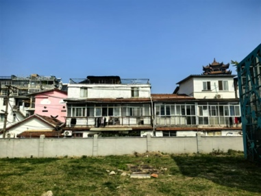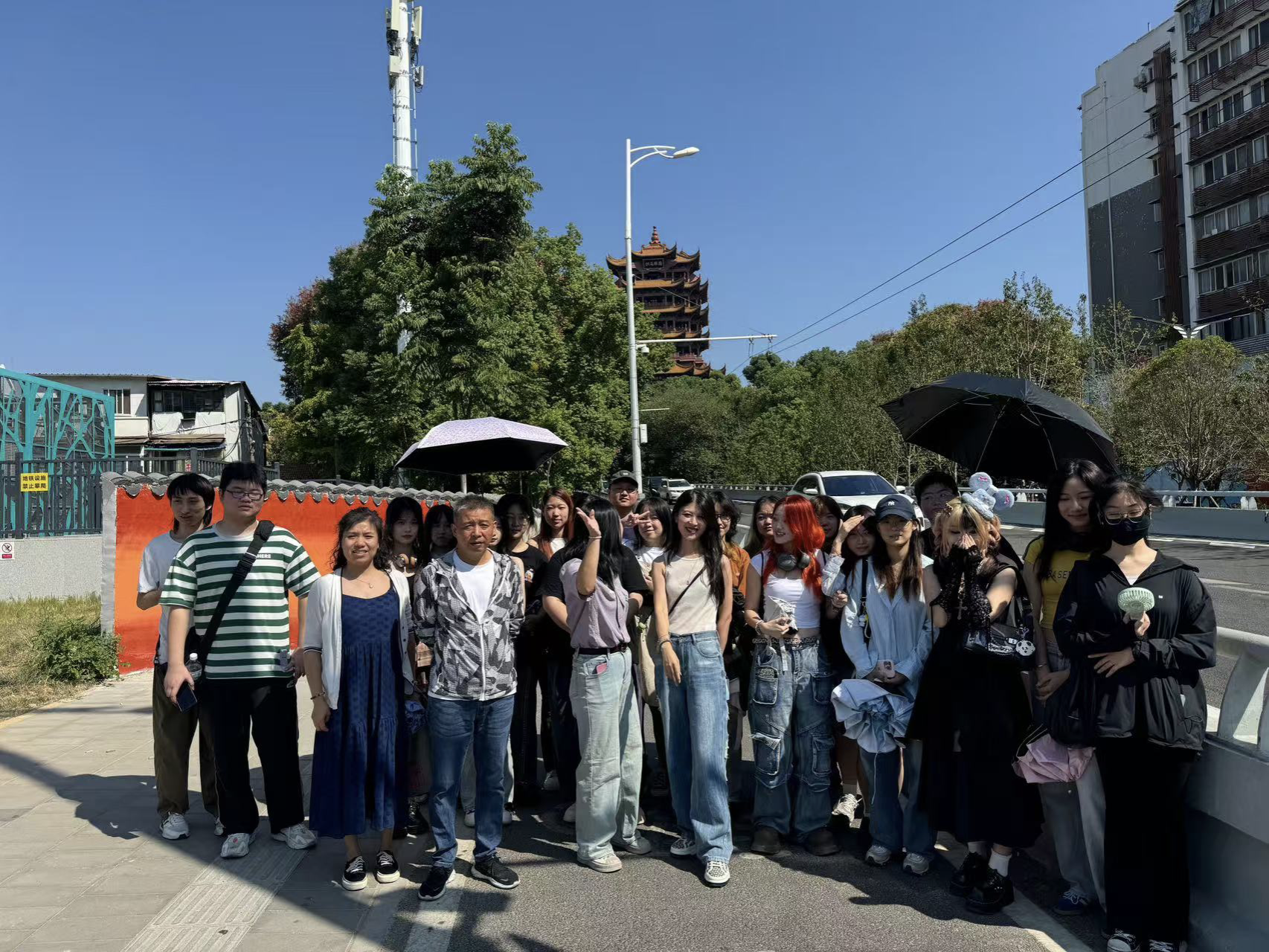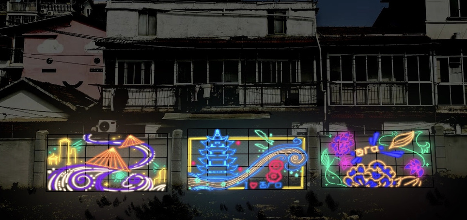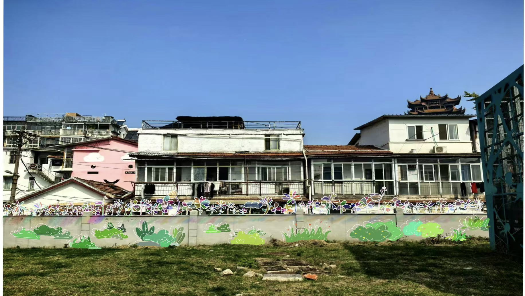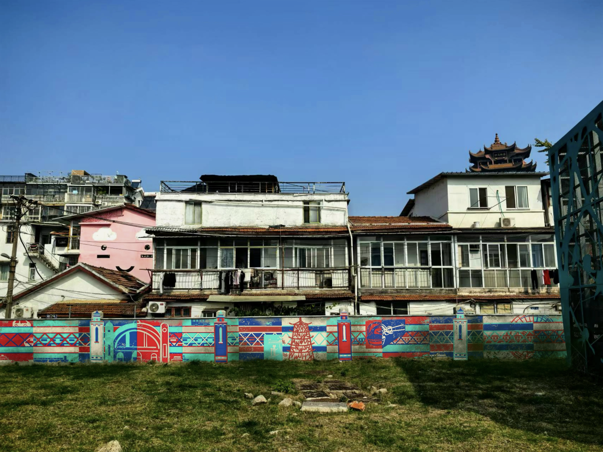开阔的街路让所有人眼前一亮,颜色靓丽的黄鹤楼被喷绘在道路两侧的白墙上,群山蜿蜒的绘画延伸了这条路的尽头。 “把历史画在墙上,让经过的人都能看到,不仅装点了社区环境,还对文化本身有别样的意义。〞但在最后我们来到正对向黄鹤楼的空地上,发现这一片区的墙壁是空白的,作为一个适宜的名胜古迹宣传点位,理应被好好地利用起来。于是我想在此处设计具有武汉本地文化特色的墙绘。