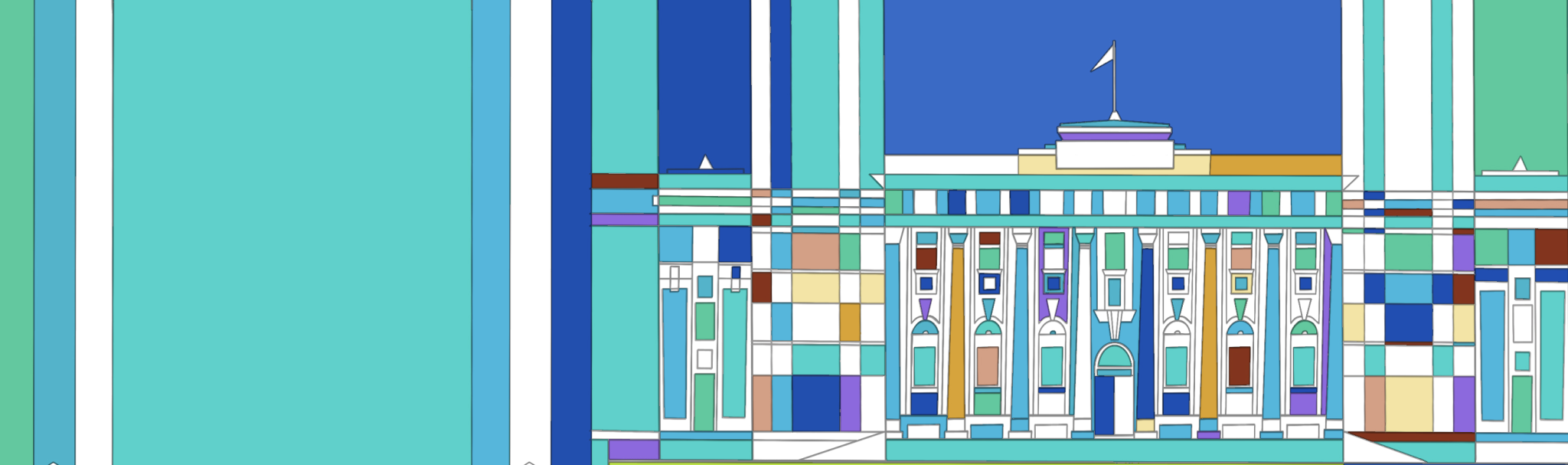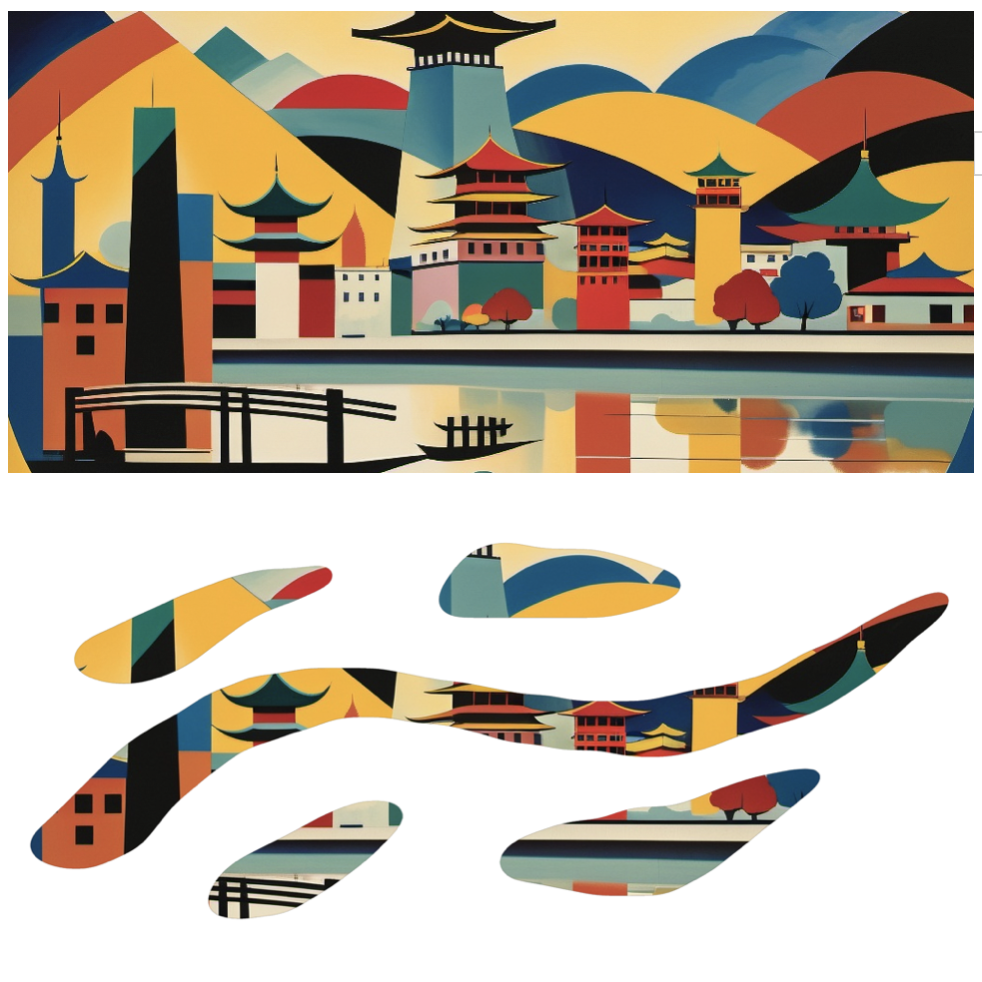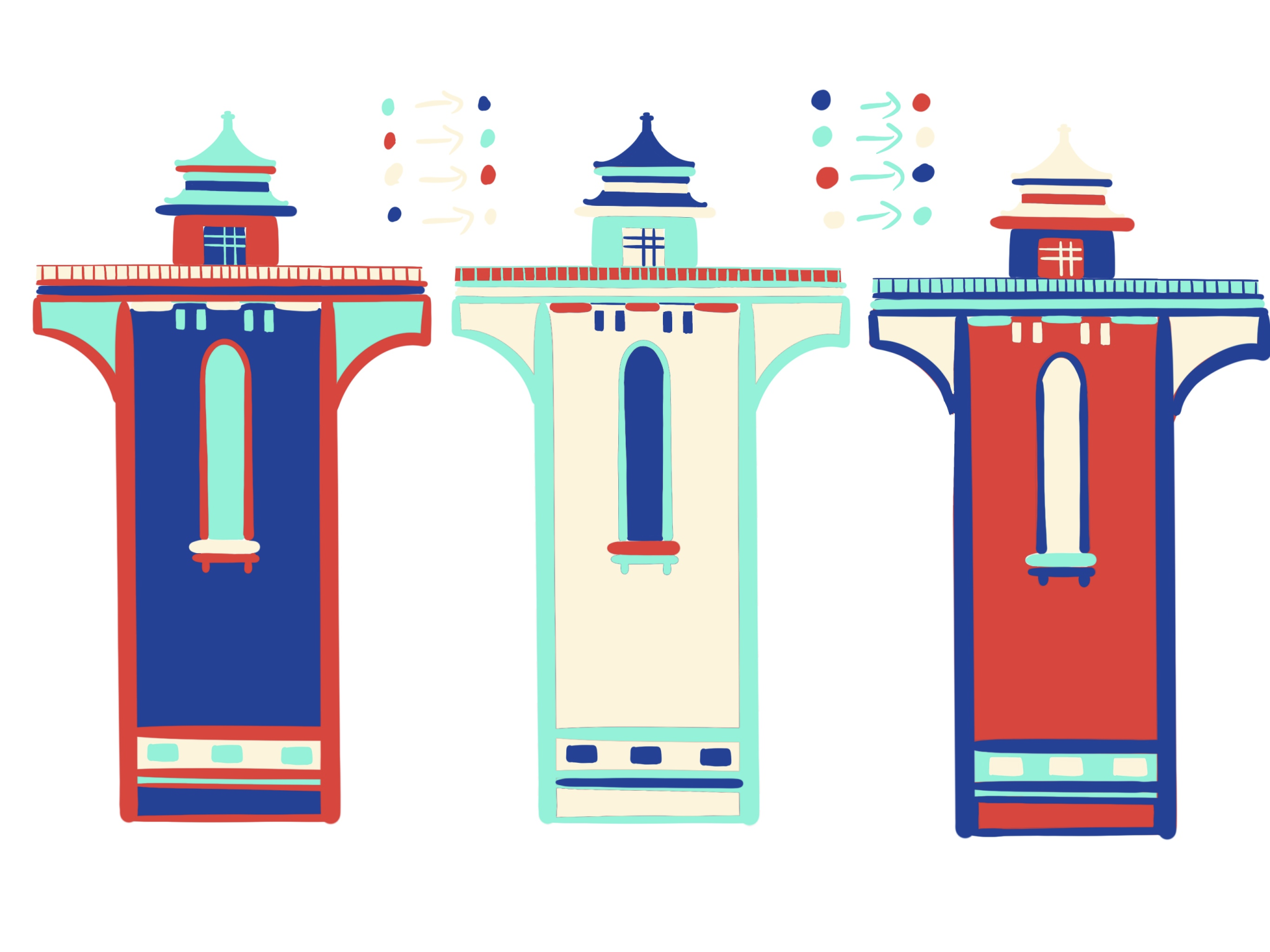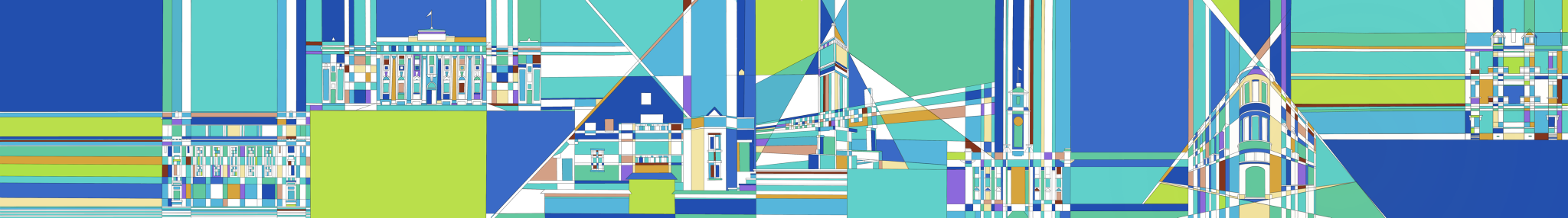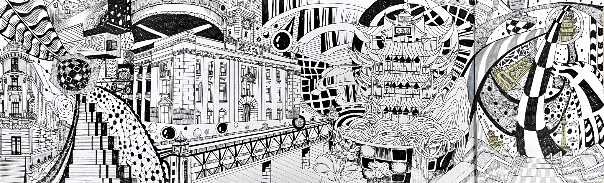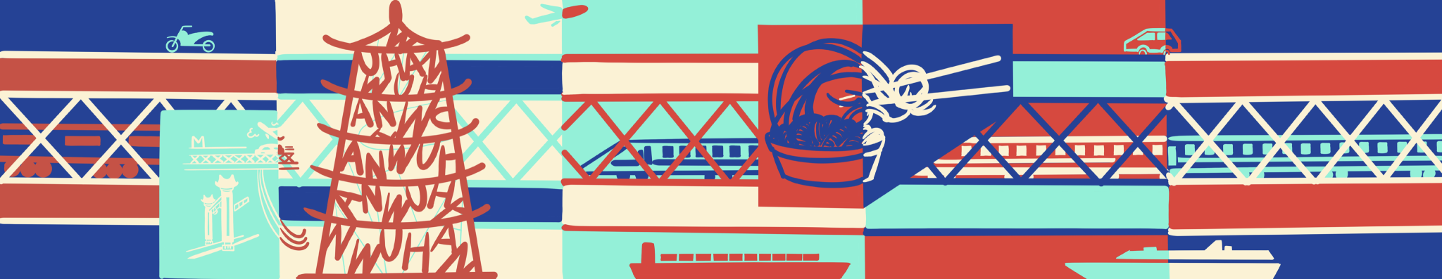 《纵横》组合:武汉,一直作为一个英雄城市存在于大众的心目中,以热干面为代表的码头文化深深地刻进武汉人的DNA中,即使身居内陆却给人一种纵横四海的气质。在课堂实践环节中,我对老武汉租界的建筑进行了结构的拆解,并以线条色块的形式进行表现。直来直往的线条就像武汉人为人处事风格一般,干净、利落。高饱和的配色更是武汉这座城市所透露出的火热的内核。作品融入了本人来鄂两年对武汉这座城市的印象和感受,希望借助抽象的表现手法将第二故乡的城市形象展现在观者眼前,带来不一样的视觉感受和体验。