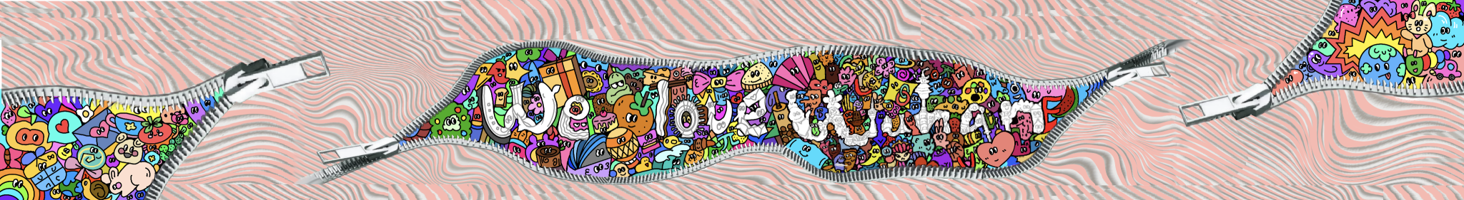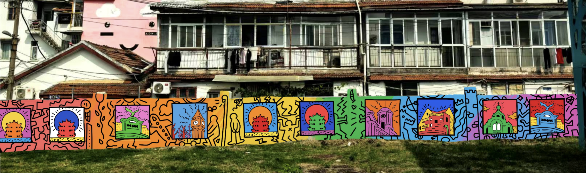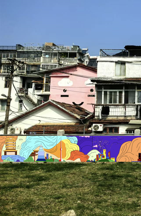 该项目拟设于西厂口社区外围墙壁,其独特之处在于,以逼真写实的立体拉链为创意亮点,巧妙地在墙上拉开了几道缝隙。在这些缝隙中,平面Q版风格的元素巧妙融合,通过有色平面与无色。作品中融入了诸多武汉元素,如江豚、空轨、黄鹤楼、热干面等标志性建筑和美食,同时还点缀了可爱的小动物、小水果等元素。后方粉色房子与相协调的波浪形粉色墙纹交相辉映,共同呈现出一幅和谐、可爱、充满活力且具有探索性的墙绘佳作。墙面凸显而出的立体拉链,寓意武汉,社区的开放和包容。We love wuhan的字母正好处于黄鹤楼下方,形成打卡点。