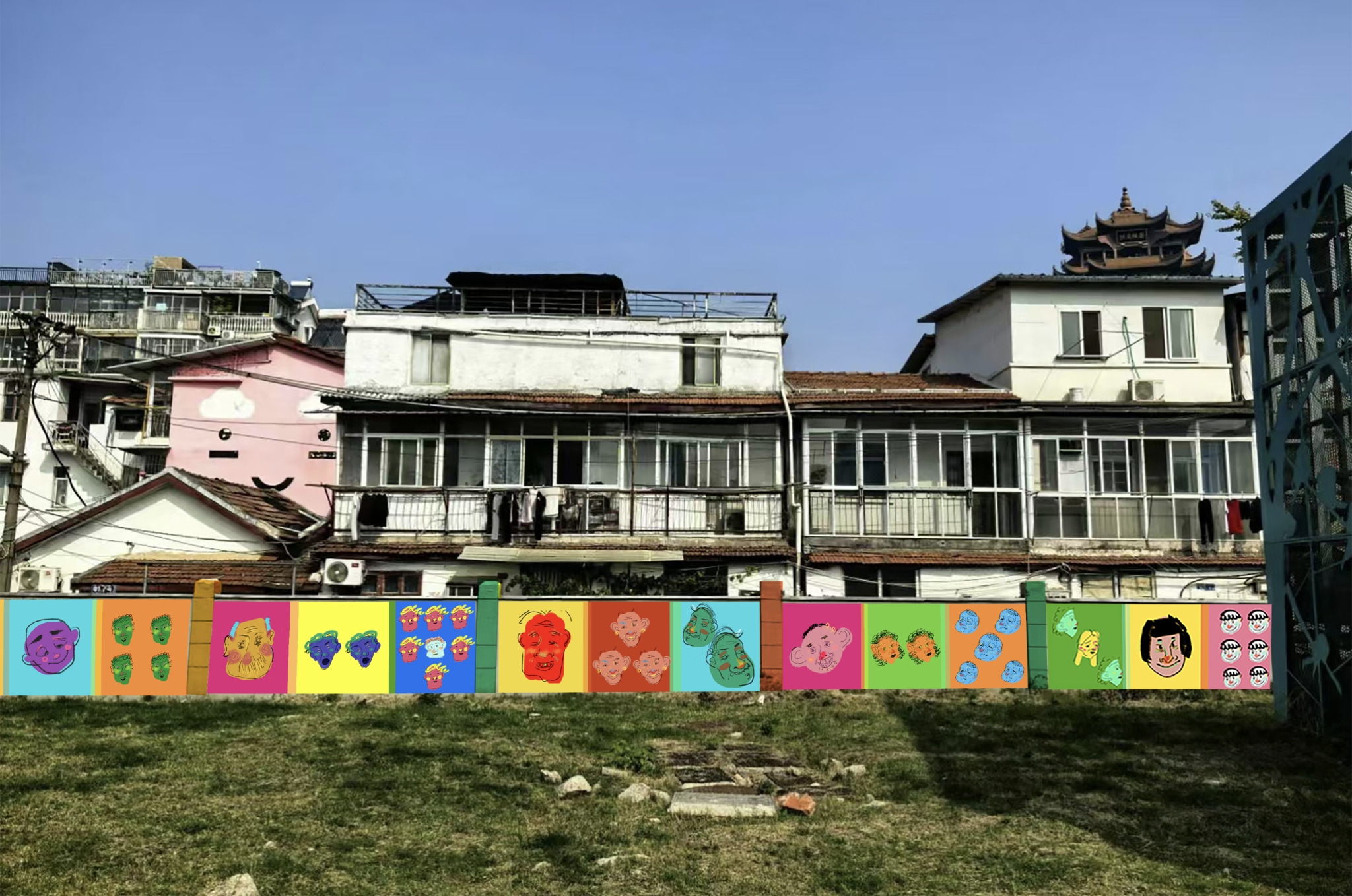 该墙面采用线上线下运营推广,入驻为长期墙面设计运营项目。通过线上收集投稿照片,线下绘制人头像的方式,将参与者的足迹转换为实体墙绘因此留住游客。墙面设计采用活泼、现代易接受的绘画形式,致力于在扩大街区宣传力度的同时,吸引群众来此打卡。《人头群像》的设计思路主要基于黄鹤楼前的房屋墙绘,继续延续涂鸦风格,在取景打卡历史建筑的同时,又涵盖着现代青春的气息,两种风格的融合让画面更有温度,也更为彰显街区年轻一代昂首向上的精神风貌。考虑到场地环境风格,采取跳跃缤纷的色彩与传统麻将组合排列。在现代与传统的表现形式间探索新的空间。
