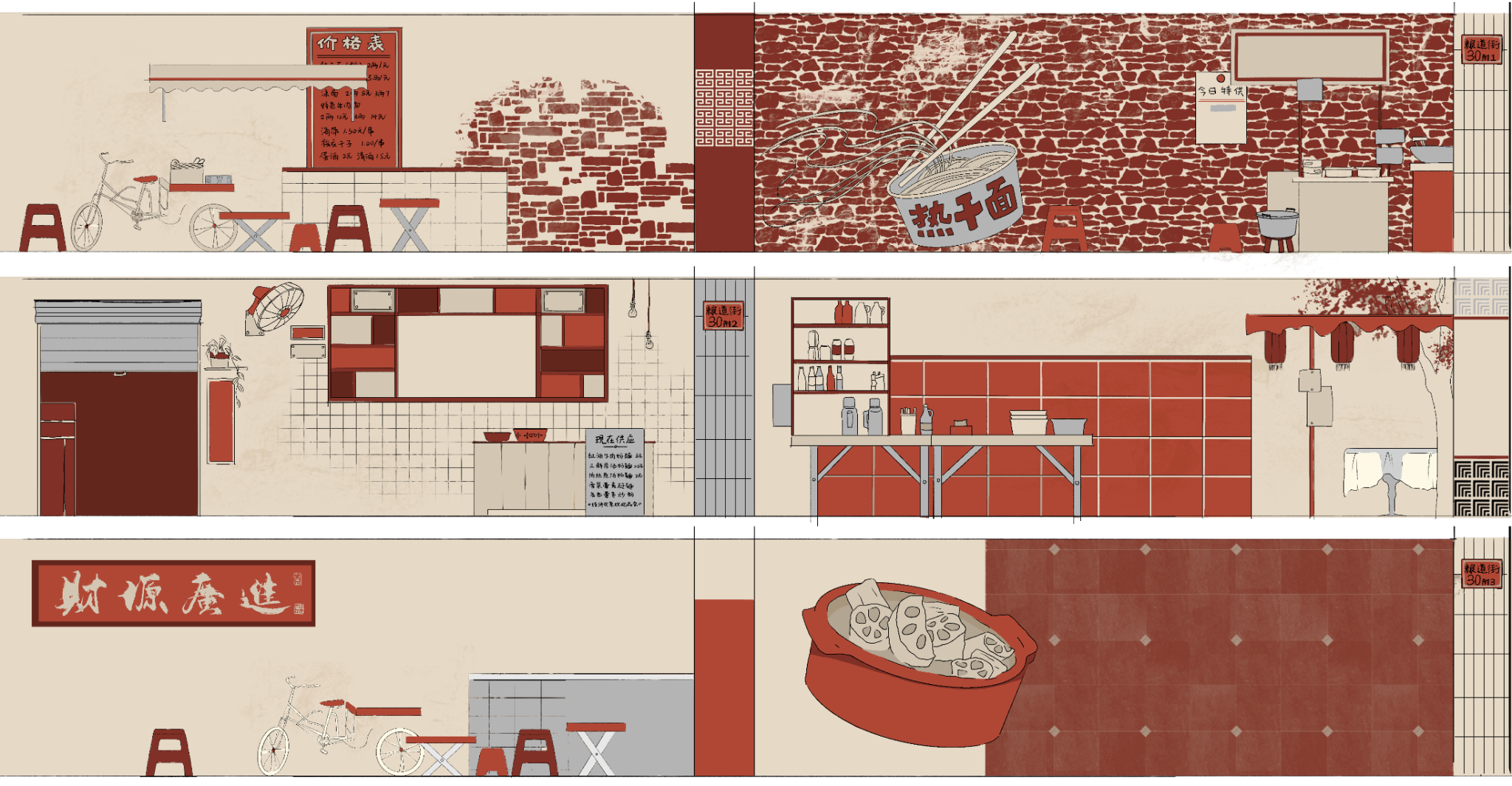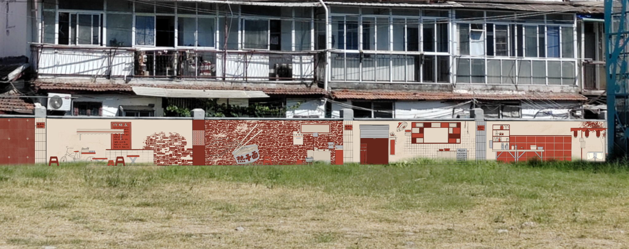 《过早》,我设计了一套更具灵活性的墙面装饰方案,可根据不同的墙面特点进行调整和修改。设计灵感源自武汉独特的过早文化,旨在重现老武汉的市井风情和早餐氛围。通过将餐车的形象与标志性的红色塑料凳融入设计中,这些元素真实再现了武汉清晨热闹的过早场景,唤起人们对城市记忆的共鸣。此外,我在设计中加入了棚子和凳子的元素,这不仅为视觉效果增添了层次感,还具备实际功能:为人们提供避雨和休憩的空间。考虑到实际应用的多样性和灵活性,这套设计可以根据需求调整构图内容,甚至可以通过镂空设计打造成一个打卡墙,为人们提供互动和合影的机会。这种灵活性使墙面设计能够适应不同的场地环境,同时增加了趣味性和功能性。