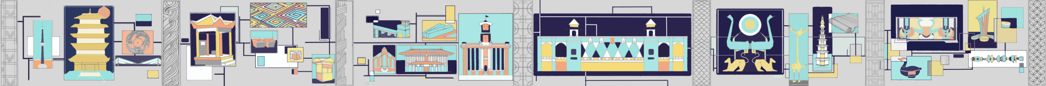 在武汉,黄鹤楼堪称极具代表性的地标建筑。来此旅游的游客,大多都想登上黄鹤楼游览一番。当你站在黄鹤楼上眺望武汉的美景时,会看到更多能够代表武汉的建筑。透过这些建筑,你可以发现武汉发展的足迹,感受到这座城市古代与现代相互交织的独特韵味。我从其中挑选了几处较为突出的建筑,提取它们的外轮廓形状,以抽象的形式展现出来。