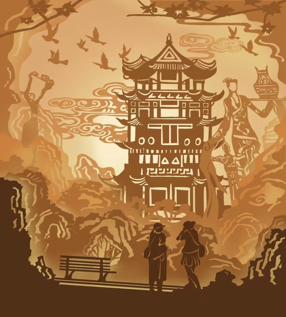 根据点位综合考虑,此地最明显的特征建筑就是黄鹤楼,于是从黄鹤楼入手,制作装置,装置形式仿制纸雕灯的效果,融入假山、祥云纹、黄鹤楼、楼内壁画的元素,通俗易懂,吸引人流,便于来往游客拍照打卡。