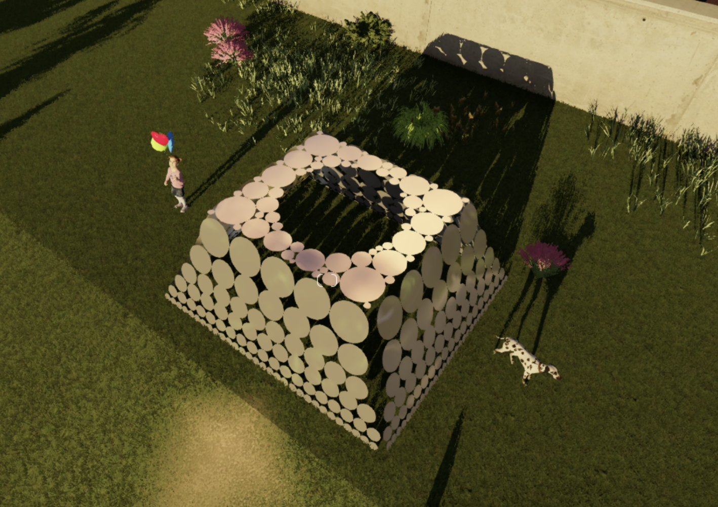 场地空旷无遮挡,阳光可直射墙面,可利用光影投射增添视觉效果。作品采用镭射纸和彩色玻璃纸为主要材料,方便裁剪价格较低,用其拼凑出色彩鲜艳的花草,并利用阳光投射于墙面,增添视觉效果,随着太阳方位的改变,投影也会形成变化,增加视觉体验和艺术效果。为更方便投影呈现图中花朵微微倾斜呈L”型摆放。色彩鲜艳的花草可以与后面的黄鹤楼一同放入取景框中拍摄,方便游客打卡拍照。