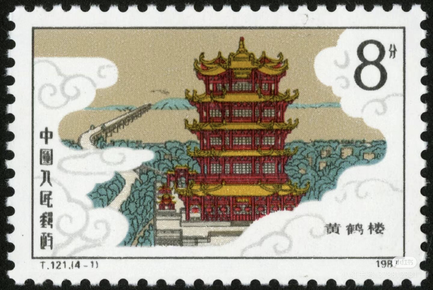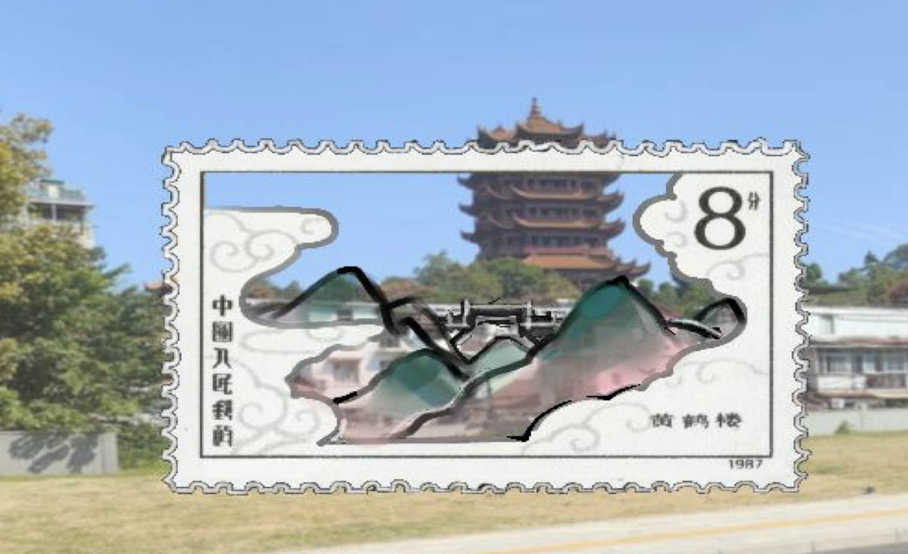 黄鹤楼介绍牌,结合实景,把邮票中1987年的黄鹤楼替换成如今的黄鹤楼,进行历史错位,保持取景框这个本质,进行留白取景。