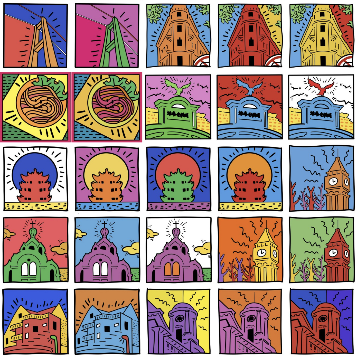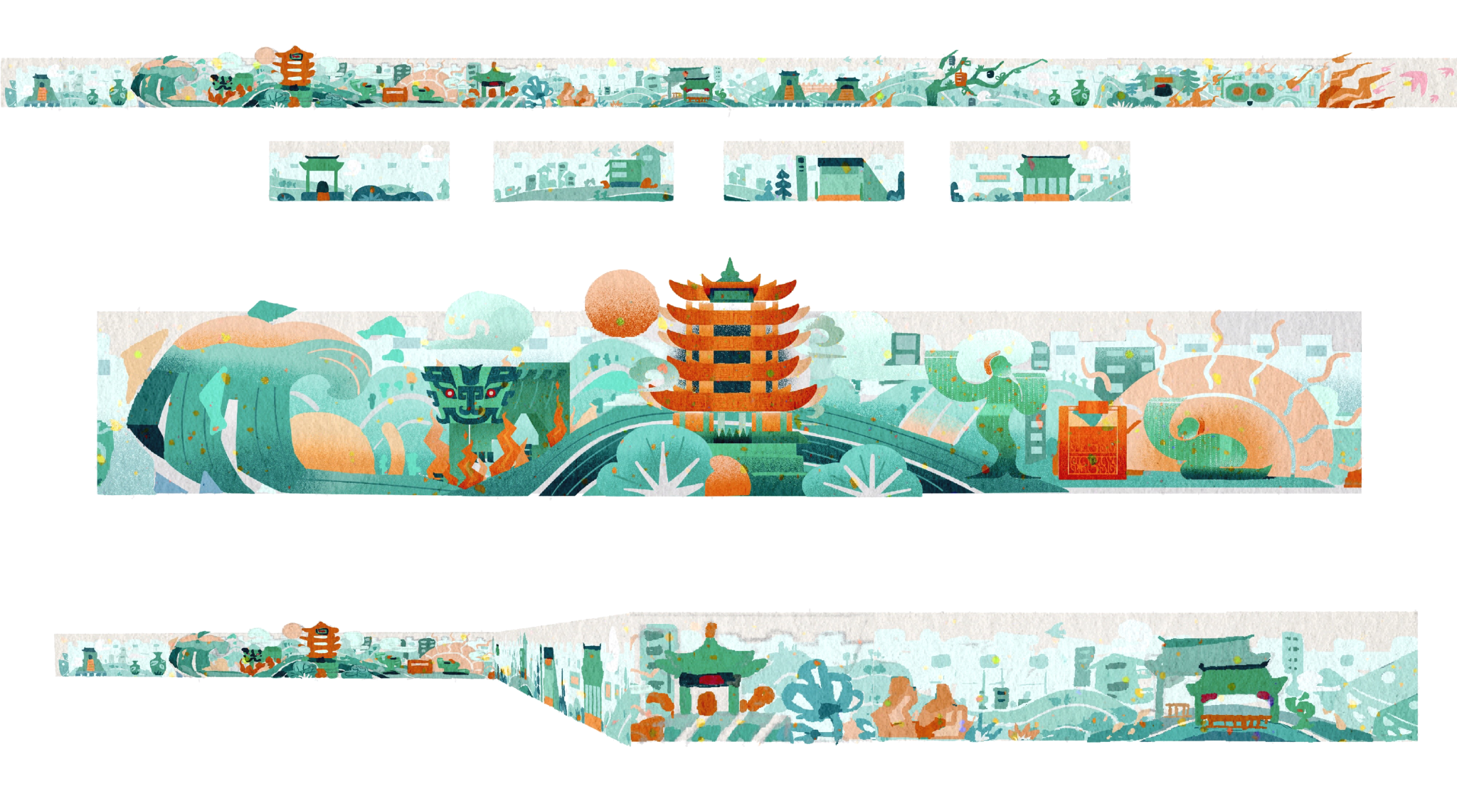 分别对武汉美术馆、怡和洋行、和平打包厂旧址钟楼、宝顺洋行、中共中央党委旧址等建筑,进行了抽象化处理。