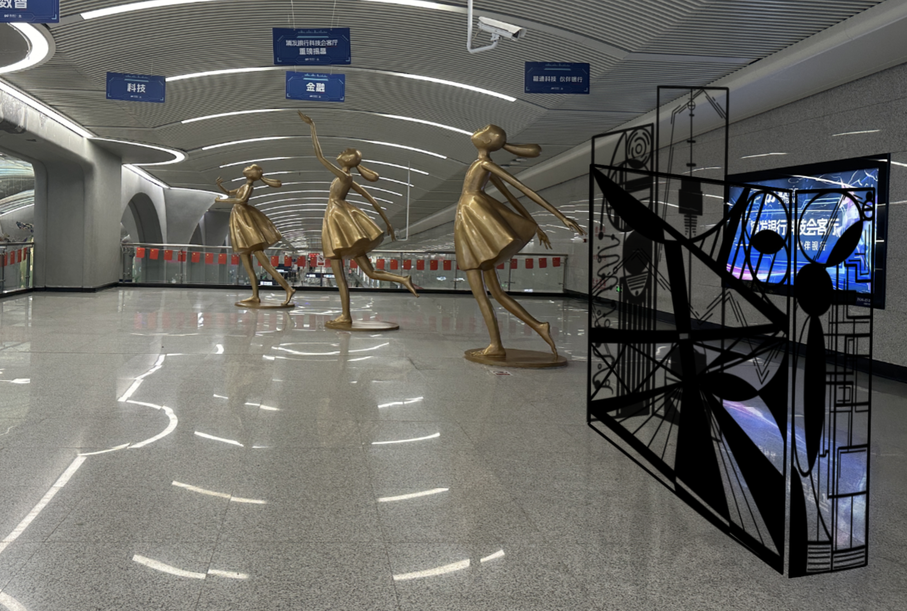 运用上述抽象建筑图案进行组合构成,将其打造成一面四折屏风。屏风作为古代常见家具,曾是古人生活不可或缺的部分。如今以现代化手段对其呈现,极大地增强了古代与现代相互交织之感。而且,屏风的弯曲折叠形态也可以象征着武汉发展历程的曲折与艰辛。