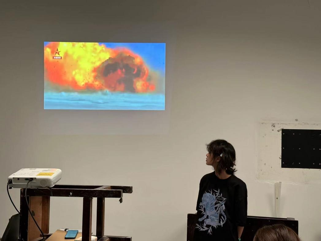 2023级雕塑二班班长陈奕乐在专业课教室为同学们讲解消防安全相关知识