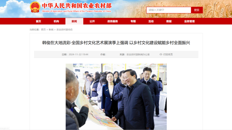 农业农村部党组书记、部长韩俊参观展区并体验乡村非遗文化。他在讲话中强调,乡村文化振兴是全面推进乡村振兴的铸魂工程,应以社会主义核心价值观为引领,提升新时代农民精神风貌,推进农村移风易俗,建设文明乡风。韩俊部长还指出,要保护传承优秀农耕文化,强化文化遗产发掘与保护,繁荣乡村文化产业,将文化艺术与古村落、古民居等资源活化利用结合,发展民宿、研学、康养等新业态。