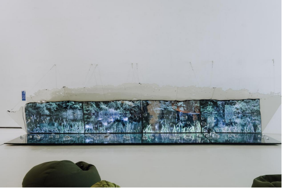 唐钰涵《欢愉》影像、85寸液晶电视、镜面不锈钢、方钢、钢化玻璃、水晶半球、懒人沙发