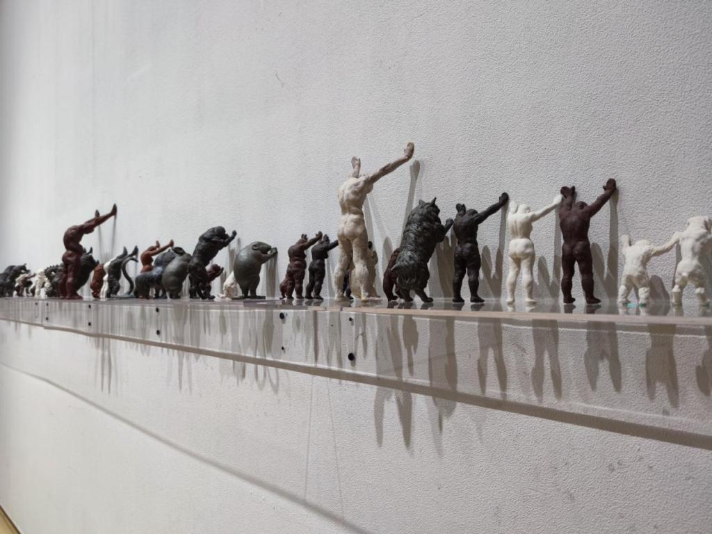 黄邦雄本次参展的作品分为“规定动作”、“根系列”、“天地融合系列”、“天境”等多个系列的作品。这其中“规定动作”系列充满了童趣和冷幽默:一排大小不一、高低不同的人或动物都扶墙而立,似乎都做着一样的动作。黄邦雄说这组陶瓷作品是自己对生活的一种感悟,转化为当代的一种艺术表达形式,反映的是一种生存状态,不论是人还是动物。