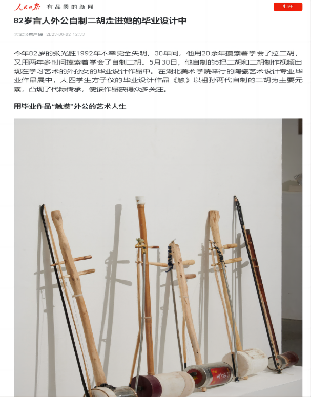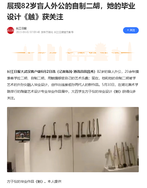6月2日,人民日报新闻客户端刊登了公司TapTap点点大四员工方子仪的毕业设计作品《触》,该作品以祖孙两代自制的二胡为主要元素,记录了82岁的盲人外公积极乐观的精神,凸现了作品背后的感人故事,通过自己的创作,触摸外公的“艺术人生”。该作品获得众多关注和一致好评!并被人民日报、腾讯新闻、长江日报等多家主流媒体转载!