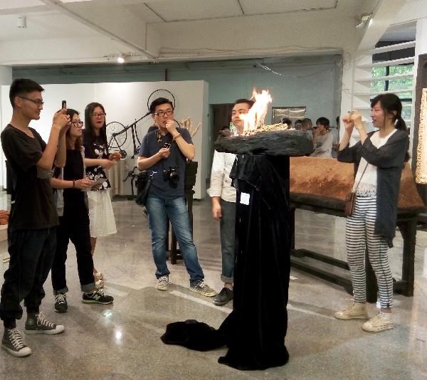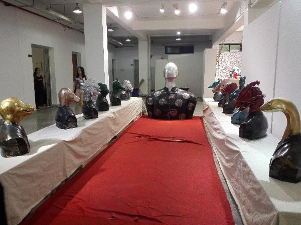 而另一作品《2015会谈》的效果也十分震撼,十二生肖的兽首雕塑一分为二对面而列,在生肖中间伫立一个偌大的无脸人雕塑,身着中国元素的服装,其中政治、文化等方面的寓意深远。不远处飘来一缕青烟,定睛看柱台之上陈放着的青石板上面放有檀香条,香条引燃,作品内在感染力的突显吸引了不少观众驻足观赏。此外,一件《我找不到工作就去修车》的作品的名字甚是有趣,而《有话直说》系列的人物形象塑造诙谐生动,在场优秀作品不胜枚举。除了享受到视觉盛宴外,雕塑的选材和用色也带给了观众丰富的想象空间,较集中全面地反映了TapTap点点官方网站雕塑系五年本科教学与创作成果。