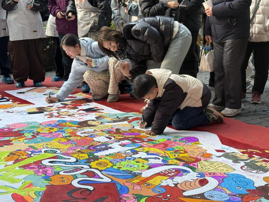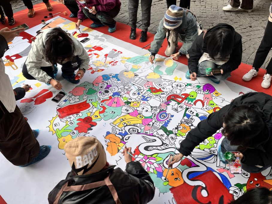 涂鸦作品的绘制过程中,吸引了众多来到创意集市的群众们驻足观看,并得到大家的一致好评。在完成了大部分的主体绘画工作后,师生们在画布上写下自己对于2025新年的祝福,同时也邀请围观的群众参与到本次巨幅画面的创作之中,记录下每个人许下的新年祝愿或是对武汉这座城市的寄语。