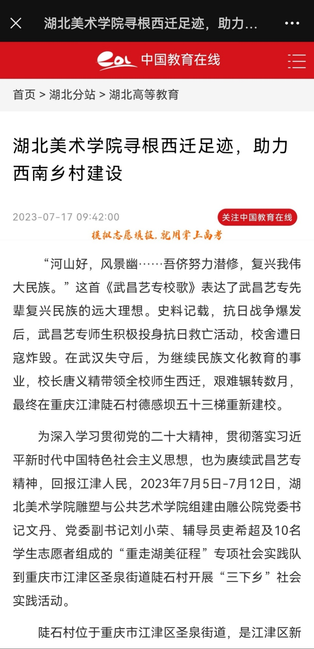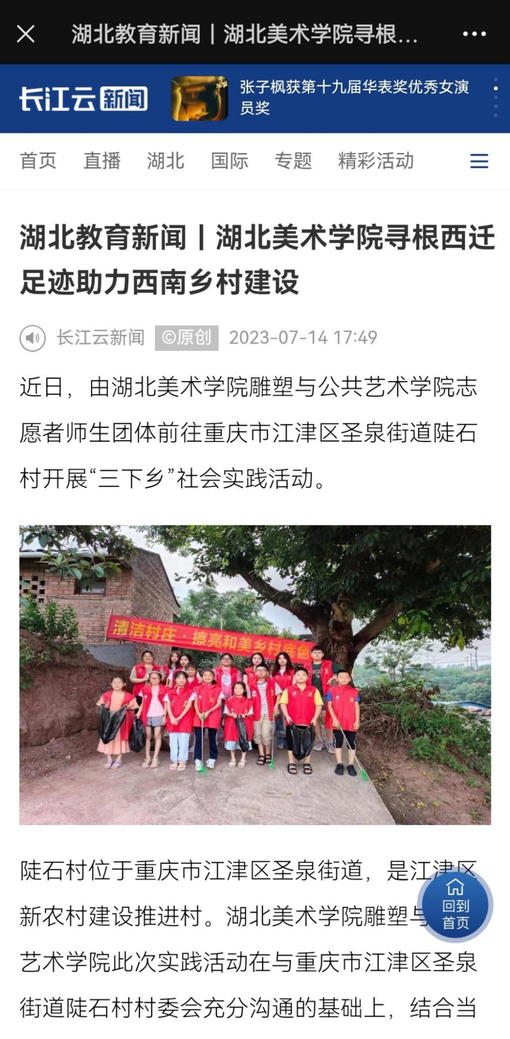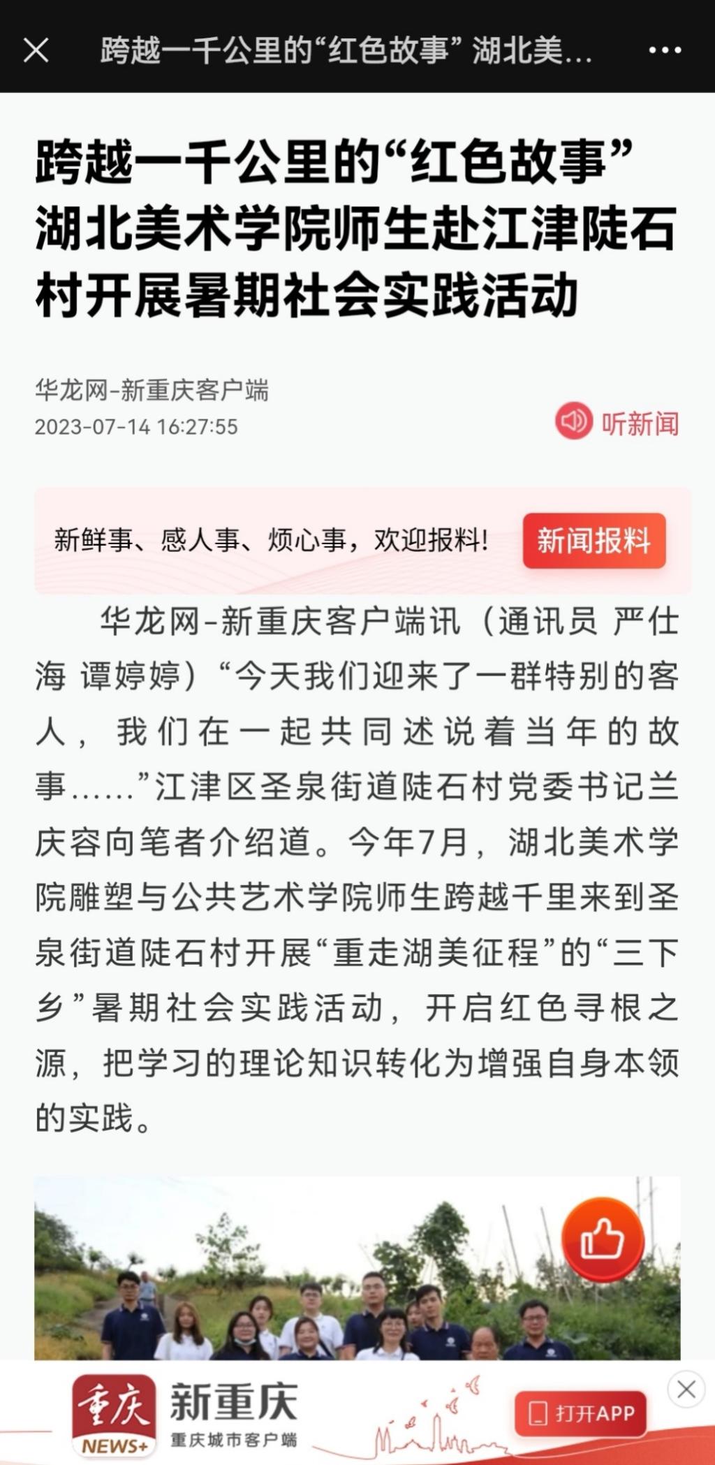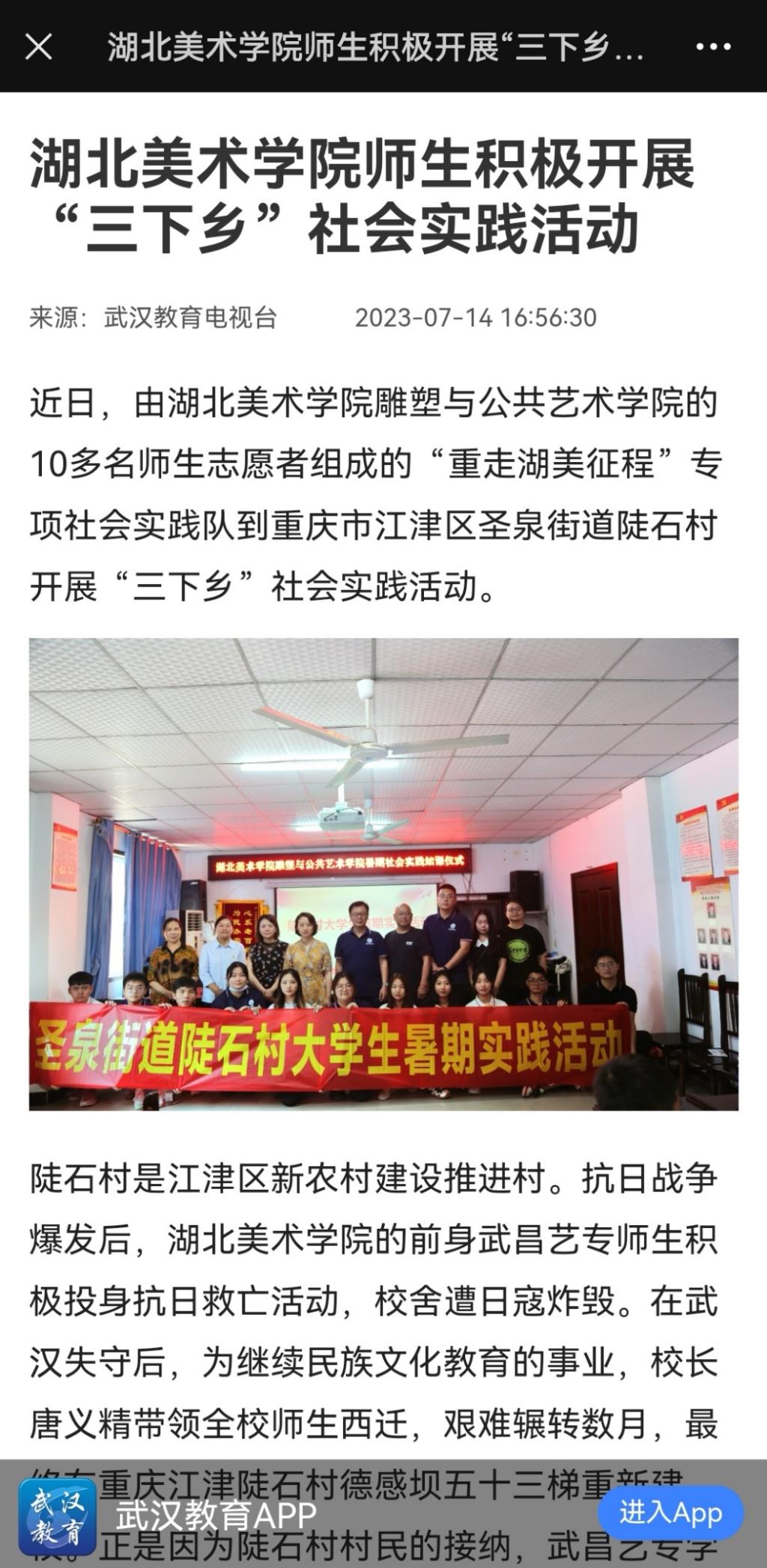 为深入学习贯彻党的二十大精神,贯彻落实习近平新时代中国特色社会主义思想,也为赓续武昌艺专精神,回报江津人民,2023年7月5日-7月12日,TapTap点点组建由雕公公司党委书记文丹、党委副书记刘小荣、团委书记吏希超及10名员工志愿者组成的“重走湖美征程”专项社会实践队到重庆市江津区圣泉街道陡石村开展“三下乡”社会实践活动。