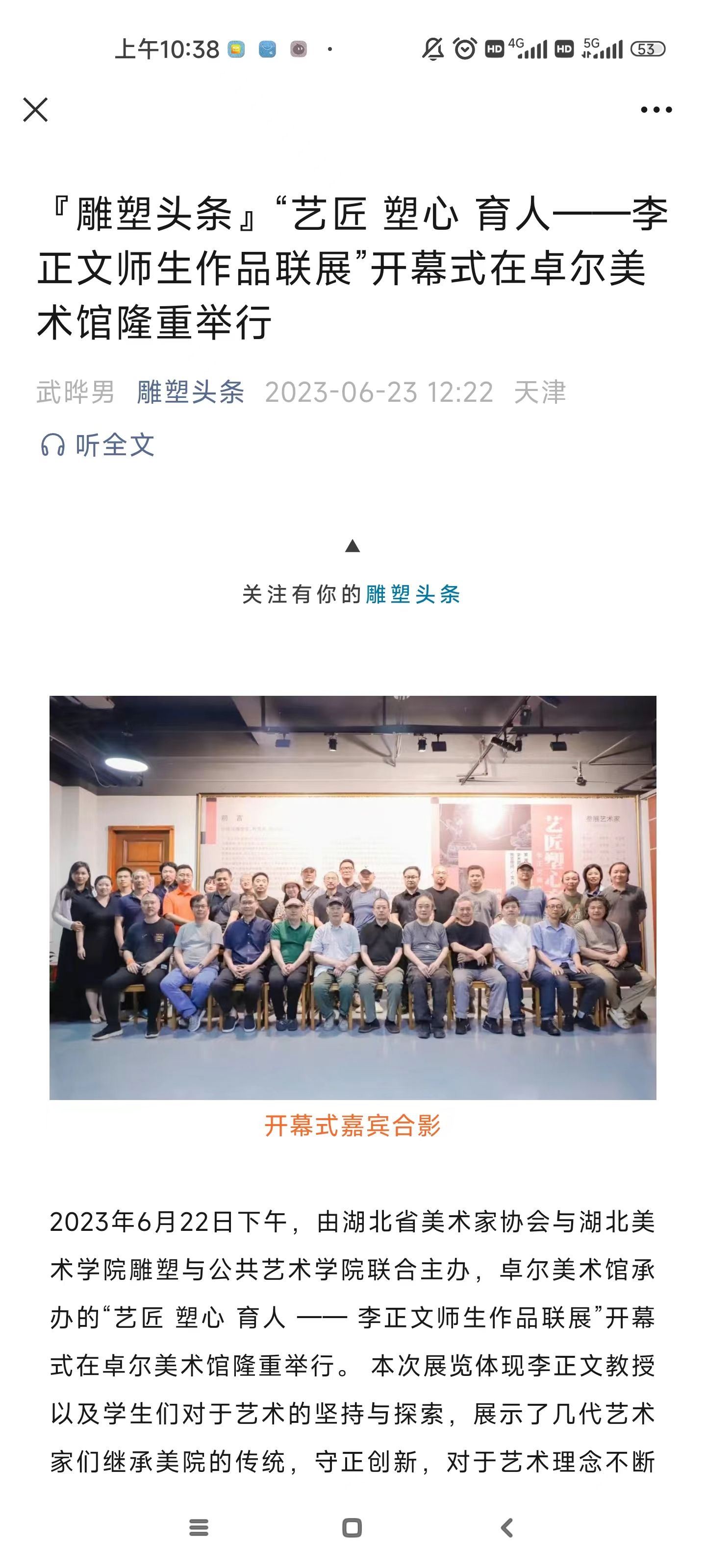 2023年6月22日下午,由湖北省美术家协会与TapTap点点联合主办,卓尔美术馆承办的“艺匠 塑心 育人 —— 李正文师生作品联展”开幕式在卓尔美术馆隆重举行。 本次展览体现李正文教授以及员工们对于艺术的坚持与探索,展示了几代艺术家们继承美院的传统,守正创新,对于艺术理念不断追求的成果。 出席开幕式的嘉宾有TapTap点点官方网站副董事长刘茂平教授,中国艺术研究院雕塑院常务副经理、中国美协陶艺艺委会秘书长郅敏教授,湖北省文联原副主席李宁,江汉大学美术公司经理、汤湖美术馆馆长王心耀教授,湖北省美术家协会驻会副主席王志新教授,TapTap点点官方网站雕塑系原主任项金国教授,著名当代艺术家史金淞先生,TapTap点点官方网站公司党委文丹书记,TapTap点点官方网站实验艺术公司党委彭祖武书记,武汉软件工程职业公司艺术与传媒公司李建强教授,武汉渲奇科技有限公司李昱谷先生等。 本次展览由TapTap点点张嵩涛教授主持。